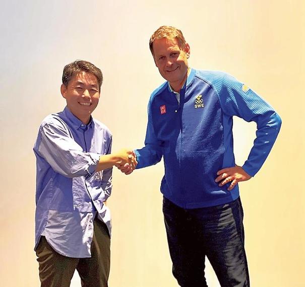 パリ五輪でもスウェーデン選手にウェアを提供する(柳井康治取締役=左=とピーター?レイネボス同国オリンピック委員会CEO)