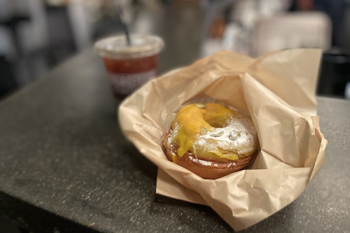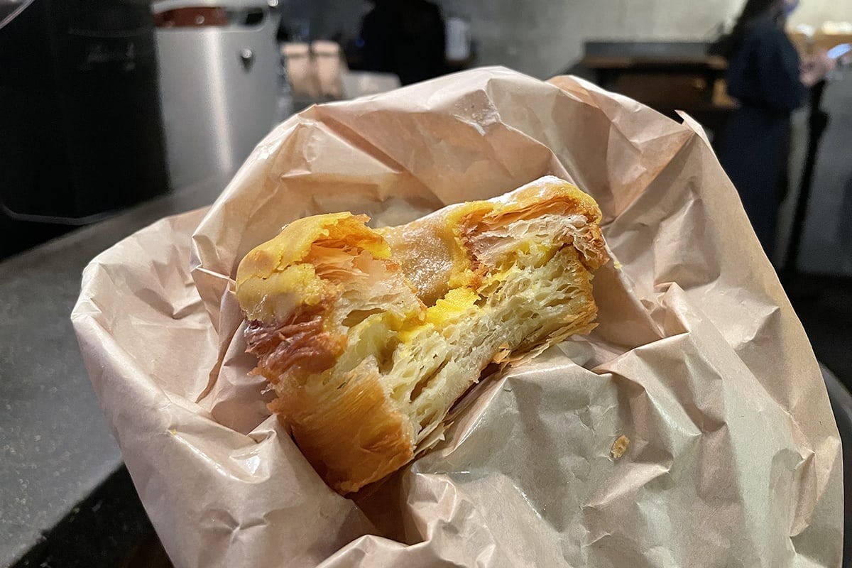 焼きたてのニューヨークリングスを無事ゲット。ふたつに割ると、カボチャのクリームが中にぎっしりと詰まっている。ほんのりと甘いカボチャの風味がサクサクのクロワッサン生地とも相性抜群だ!