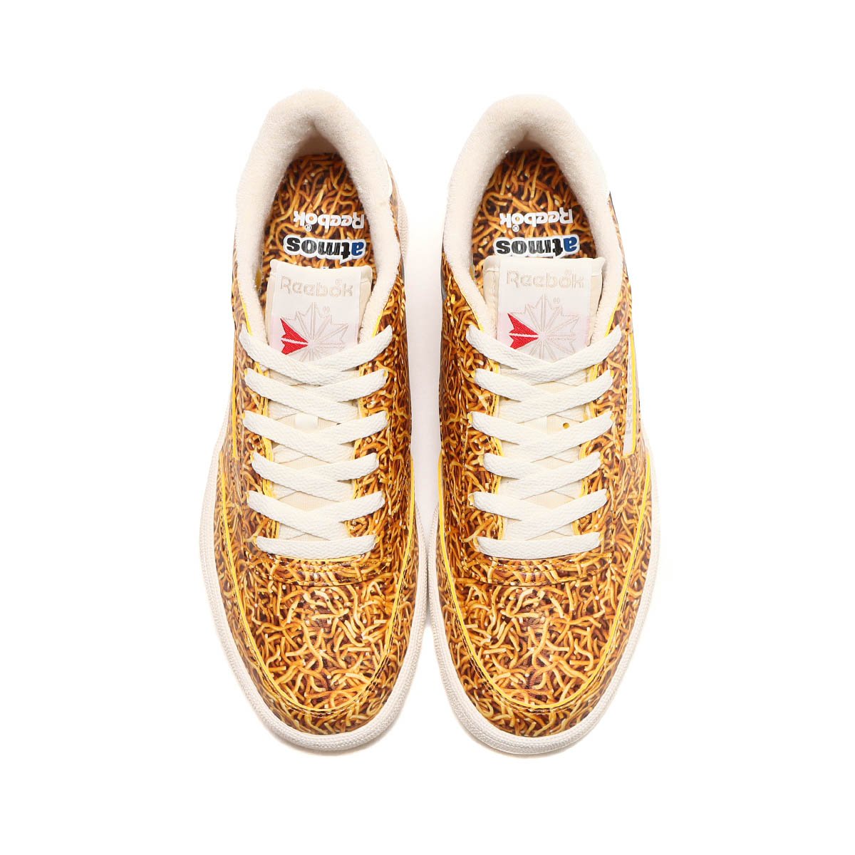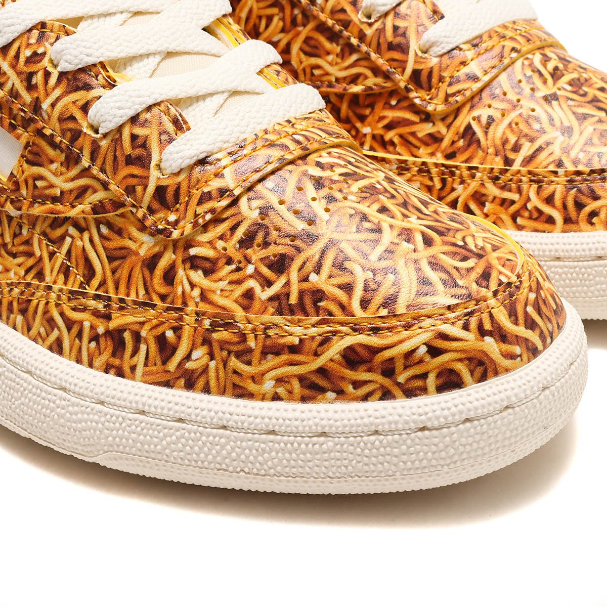 コラボスニーカーは、リーボックの定番スニーカー「CLUB C」をベースに製作。アッパー全体に麵柄をあしらい、サイドのパネルには「Ramen」の文字を刻印。ヒール部分にはベビースターのアイコンキャラクターであるホシオくんとベイちゃんを左右それぞれにプリントし、インソールは麺柄の中にトリプルコラボのロゴを配した。サイズ展開は23?29、30cmを用意し、価格は税込1万4300円。