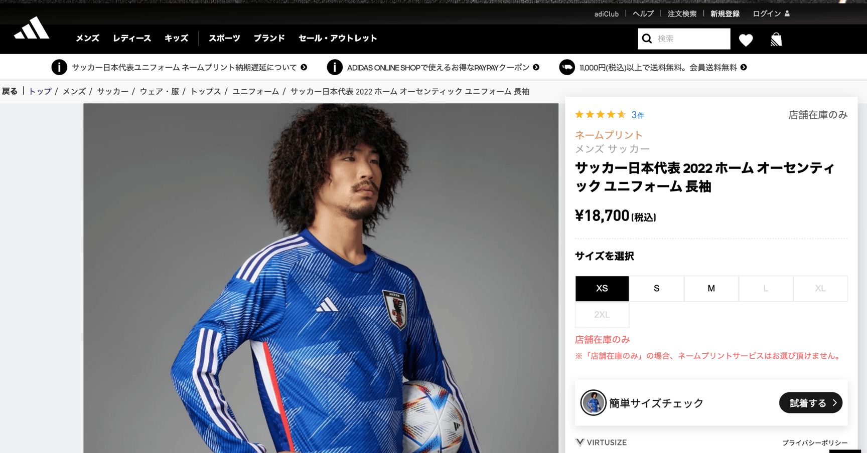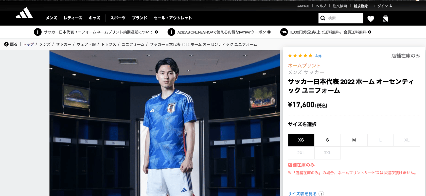 また、サッカー日本代表のユニフォームを手掛ける「アディダス(adidas)」では、実際に選手が試合で着用するものと同じ仕様の「オーセンティックユニフォーム」を展開しているが、公式オンラインストアでは11月25日19時時点で半袖、長袖共にサイズによっては品切れとなっており、在庫があるサイズも店頭在庫のみと品薄の状態。選手のナンバーと名前を入れるサービスについても、予想以上のオーダー数があり納期遅延が発生しているという。