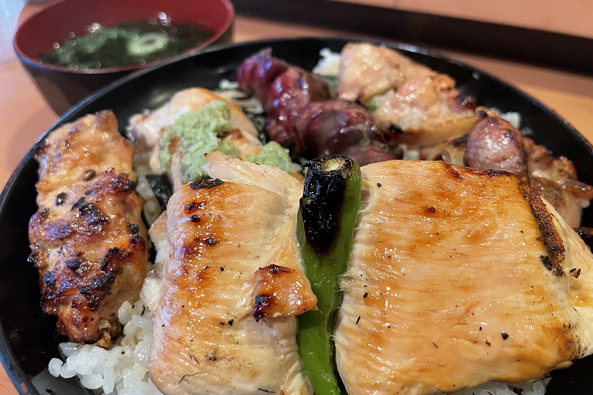 さっそく「やきとり丼」がやってきた。ねぎま、ささみ、レバー、つくね、ももの5種類のネタが豪快にのっていて、その大きさは圧巻。丼から漂う炭の匂いが香ばしく、さらに食欲をそそる。