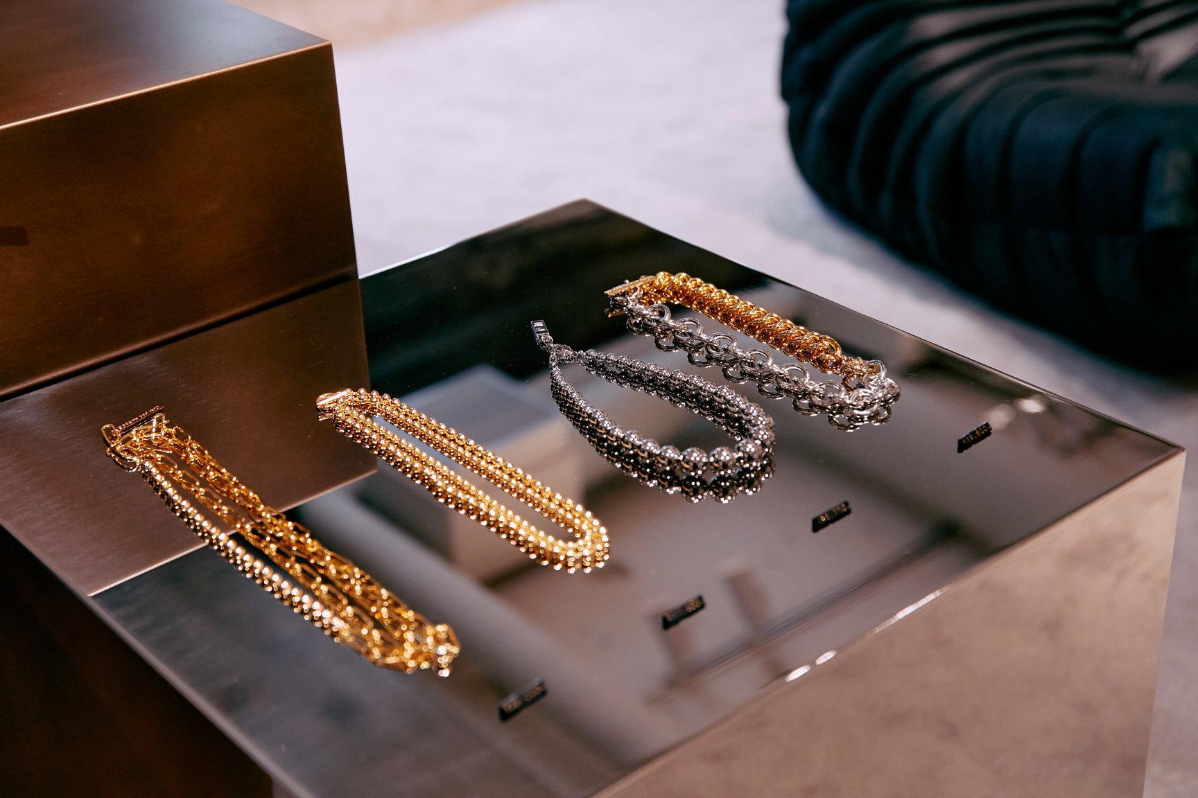 デビューコレクションとなる2023年春コレクションはアパレルにアクセサリーやバッグなどを加え、約90型をラインナップ。通常の着方とオフショルダーとしても着られる2way仕様のトレンチコートやシャツワンピースをはじめ、ベアトップやシアー素材を使ったトップスなど、ヘルシーで上品に見える大人の肌見せスタイルを豊富に揃えた。このほか、ユニセックスで着られるオーバーサイズのジャケットや、マニッシュなジャケットのセットアップ、ロゴの総柄パターンを施したニットやシャツなども用意している。ロゴをあしらったファスナーの引き手やボタン、メタルのプレートといった部品はすべてオリジナルで開発した。価格帯はメゾンスペシャルに対し、2?3割ほど引き上げている。