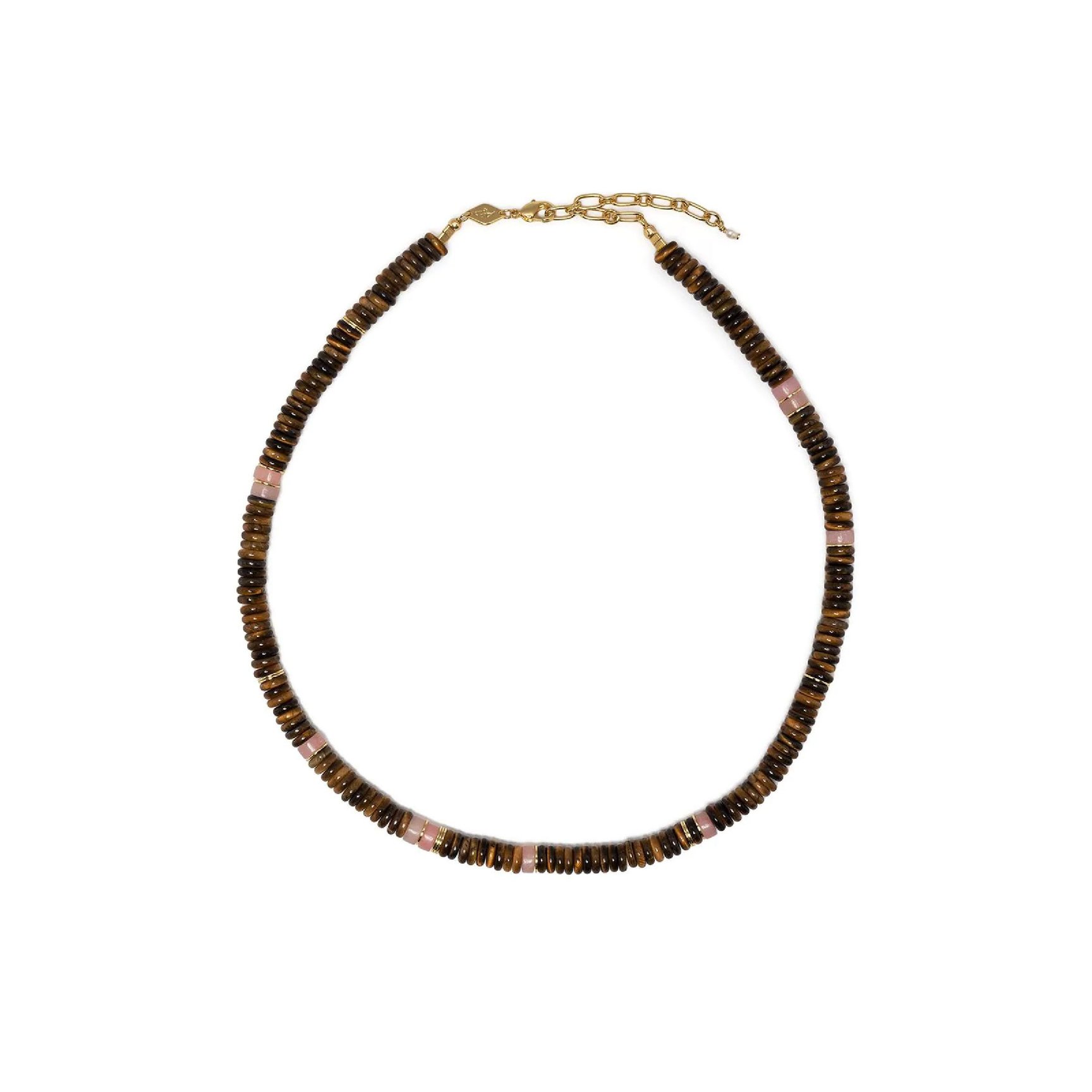 「アニールー(ANNI LU)」のネックレスは、タイガーアイとパールのビーズが連なった豪華な一品。富やビジネスの成功を引き寄せると信じられている、パワーストーンの効果がしっかりと発揮されそうなデザインです。深いブラウンが美しく、今のシーズンはニットの上、サマーシーンには肌の上が似合います。