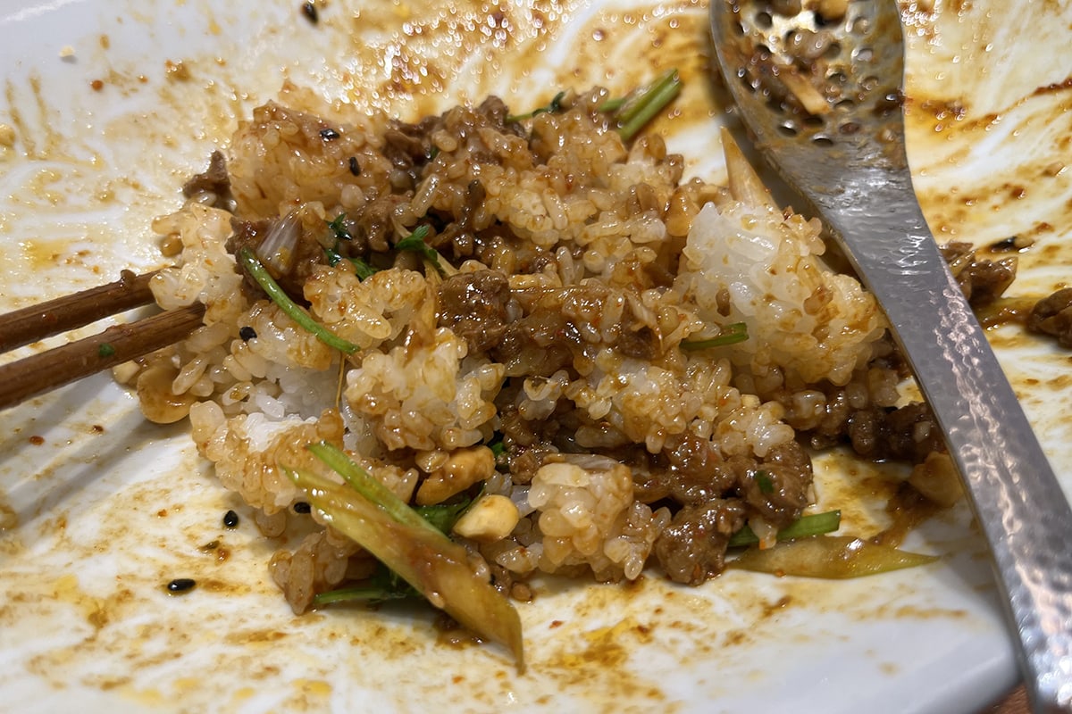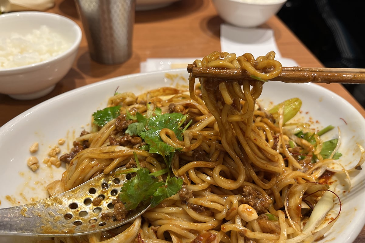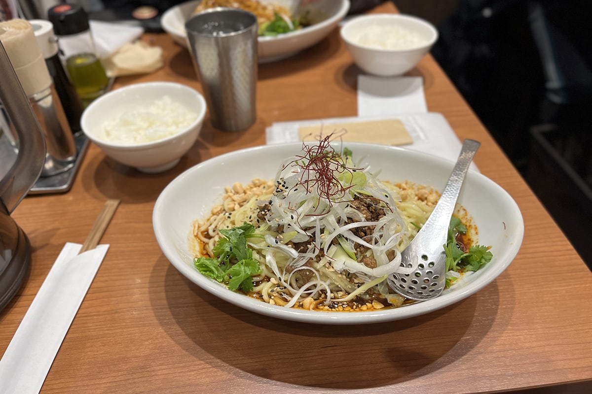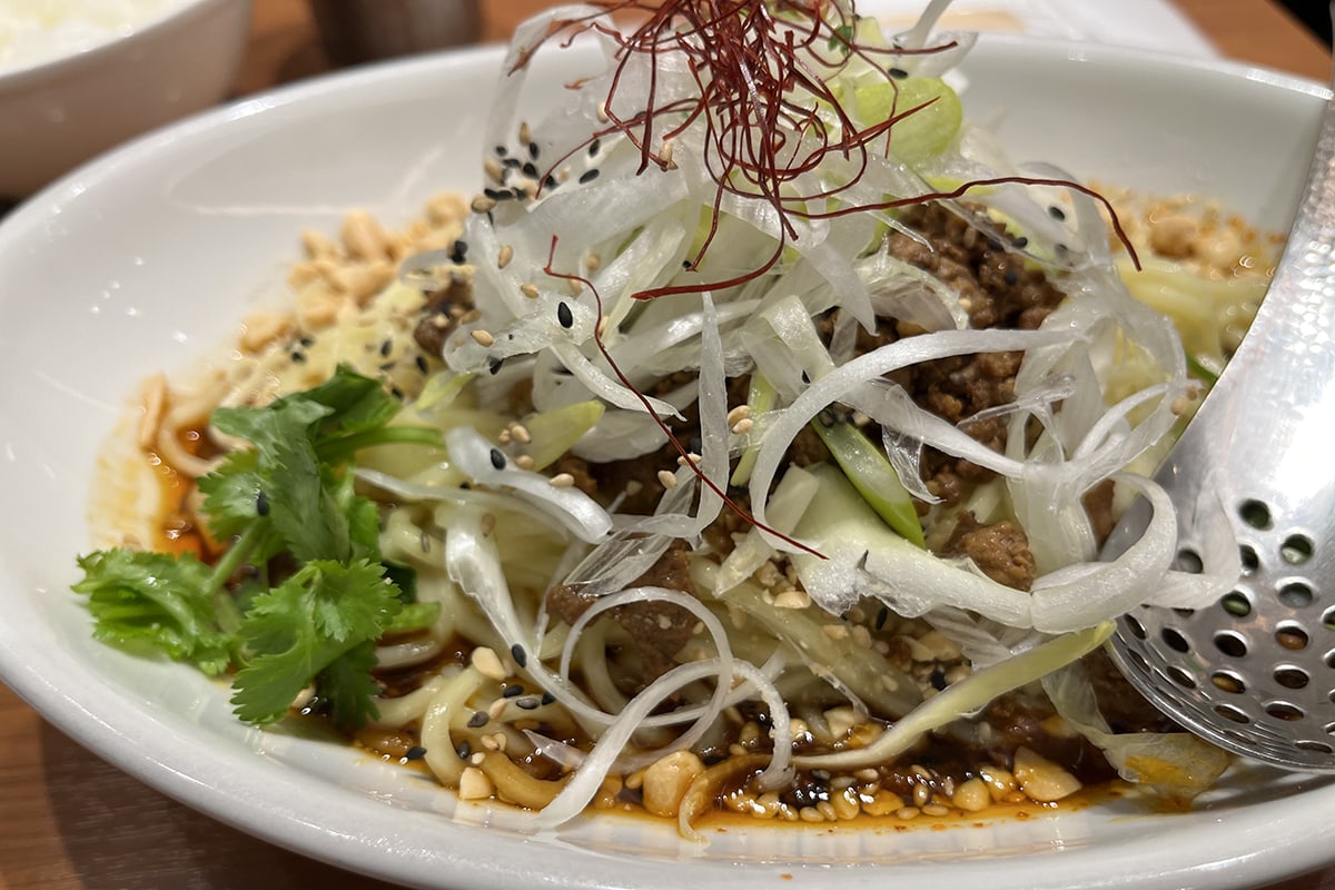少しづつまぜながら味わってもいいけれど、個人的には最初に全部まぜたい派。「しびれ」を引き出すオリジナルのぶどう山椒オイル、肉味噌、ゴマだれをしっかりと混ぜ合わせる。