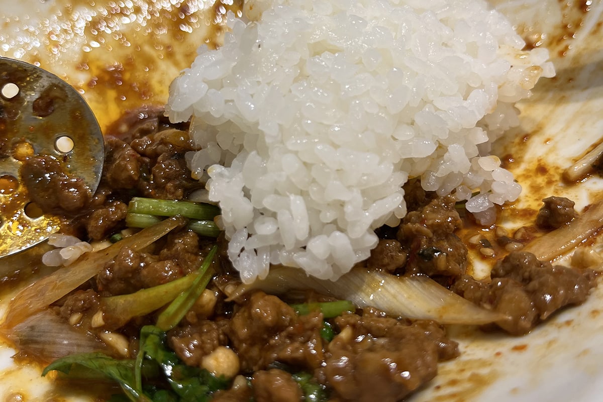奥のライスが気になっていたあなたは慧眼です。「麻婆麺」にしろ「汁なし坦々麺」にしろ、とにかく麺とご飯が合うのも「蝋燭屋」の罪深き特徴なのだ。「汁なし坦々麺」ならわざと肉味噌を余らせておいて、最後の仕上げにごはんを器に放り込む。