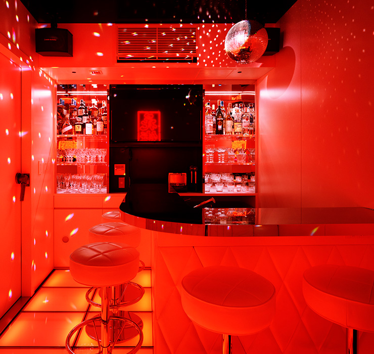ミニスナックをイメージしたディスコ風のカラオケルームも設けました。狭い空間ですがバーカウンターもあり、赤色の照明でキラキラ光るミラーボールが場末感を醸し出していて、ダイニングやリビング、ベッドルームなどとは異なる世界観が表現されているのも面白味や遊び心があると思います。
