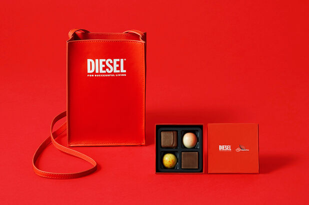 ディーゼルでは、チョコボックスとセットに、オリジナルミニバッグやアンダーウエア、ソックスなど店舗ごとにさまざまなバリエーションのギフトをセットして販売。