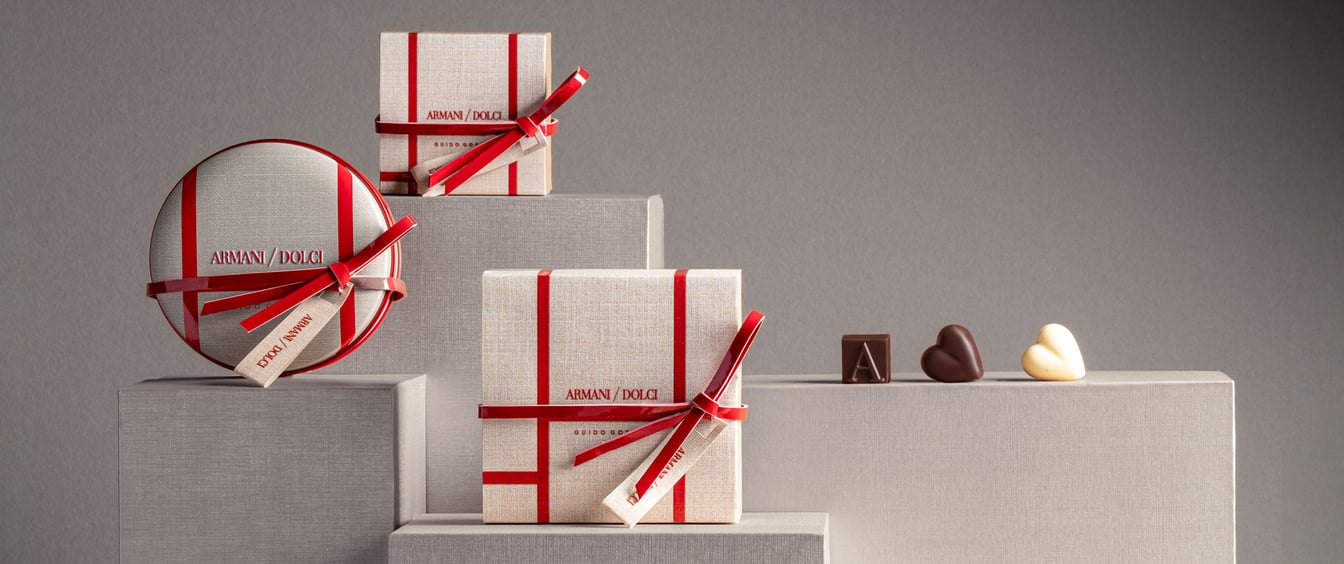 アルマーニ/ドルチのチョコレートはイタリアにて最高峰のハンドメイドチョコレートを創り出すマエストロ、GUIDO GOBINO(グイド?ゴビーノ)率いるアルチザンチョコレートメーカー、 Guido Gobino Ltd. で製造されているもの。ハンドメイドにこだわったクリエイションが高い評価を得ています。