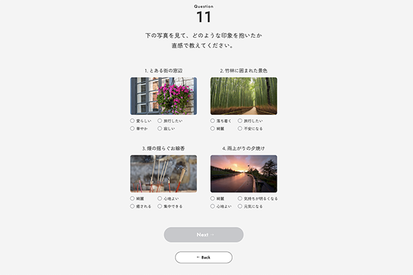 この診断でおもしろいのが、香りに関する質問以外にも、なりたいイメージや写真から受けた印象など、さまざまなジャンルの質問が用意されているところ。