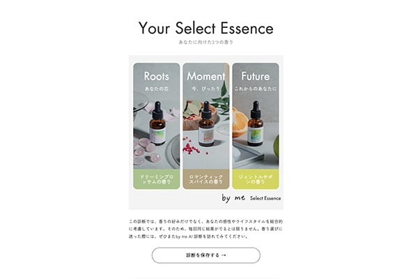 そして、Roots(あなたの芯)/Moment(今、ぴったり)/Future(これからのあなたに)といった3つの軸で、おすすめの香りを3つ提案してくれるんです。