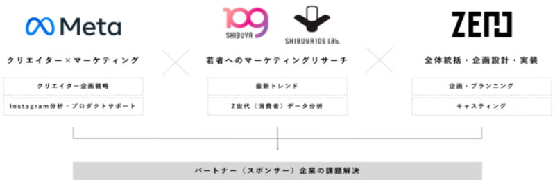 今回の提携では、「SHIBUYA109 lab.」「Meta」「クリエイター」がタッグを組み、「本質的なマーケティング」を検討するという内容。スポンサー企業向けに、Z世代との接点創出のためのクリエイターマーケティングプランを提供します。