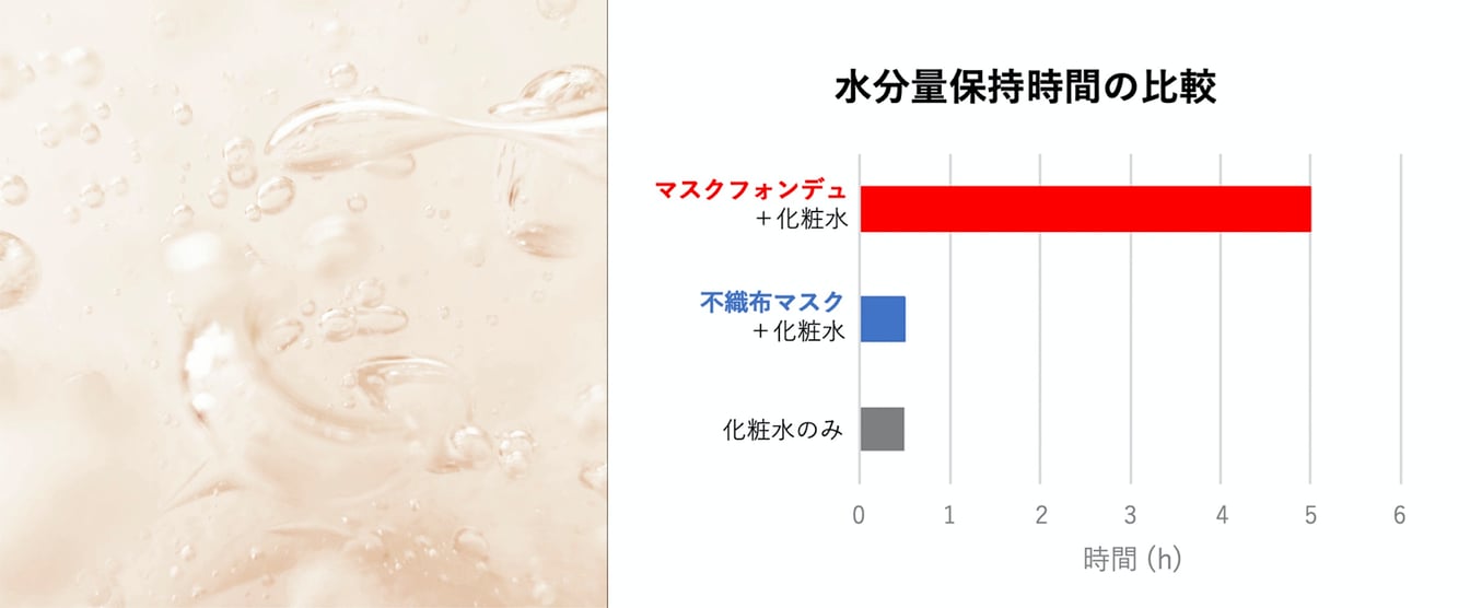 ヒアルロン酸の含有量は、同社の乳液1本分と比較して約87倍[1]というから驚きだ。なお、マスクに濃縮して含有させたヒアルロン酸の濃度は、医薬品の浸透性の観点から考えたものだという。そしてメリットはそれだけではない。
