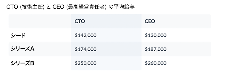 初期の段階では技術系の創業者 (CTOの役割) は、CEOの役割の人よりも報酬が高い傾向がある。これは、経験豊富なエンジニアは採用が難しいのに対し、誰でも自分が始めたスタートアップの最高経営責任者 (CEO) になれるからだろう。