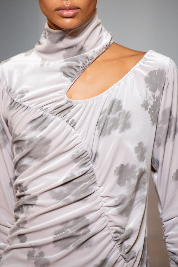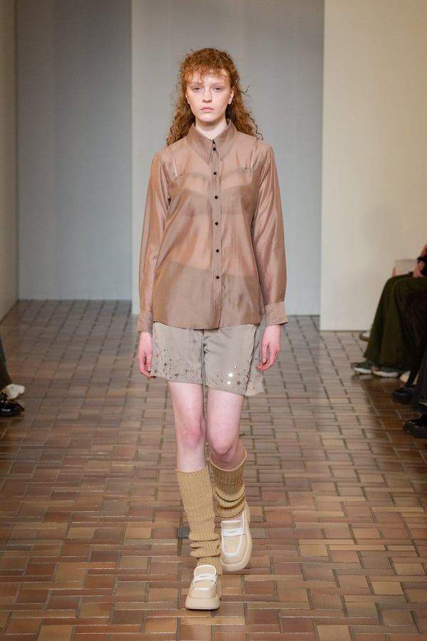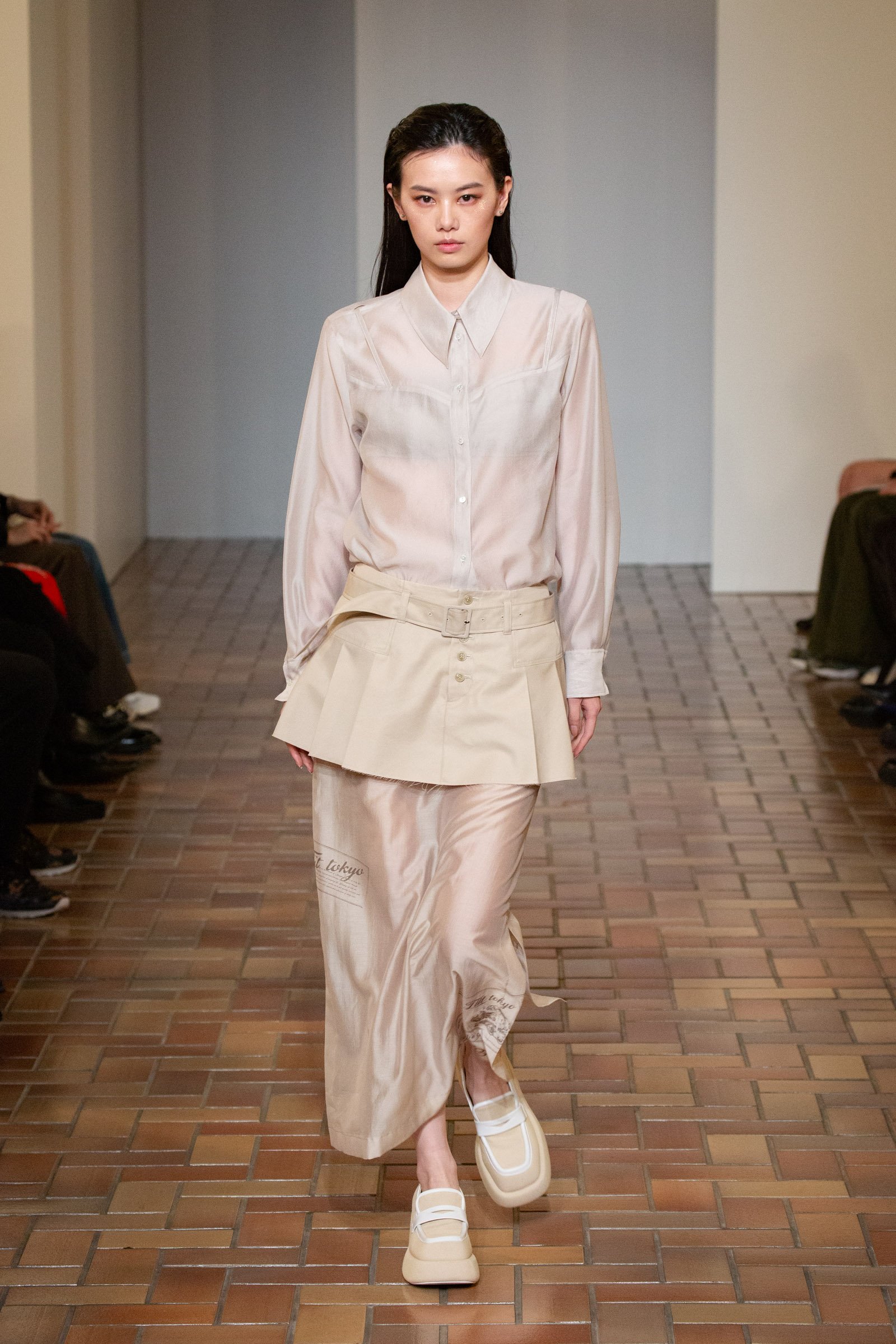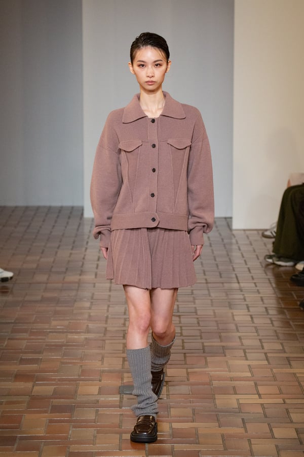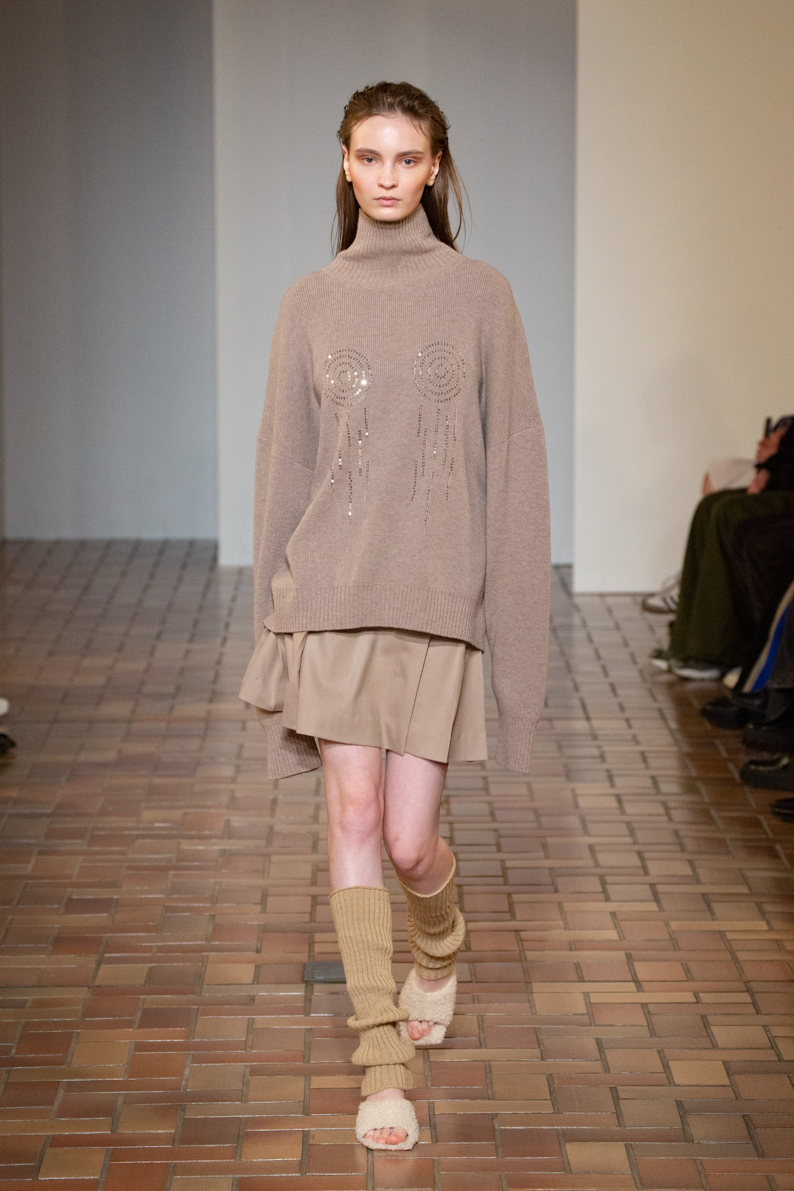 コレクションには、2023年春夏までは登場していた黒のパンツやプリントなど強いカラーは姿を消し、薄墨色の花柄のワンピースやニットのシャツとプリーツスカートのセットアップといったさまざまなベージュカラーのアイテムに加え、ビジューをあしらったニットベスト、スパンコールのついたセカンドスキンシャツ、など異素材を組み合わせたアイテムも多く登場した。