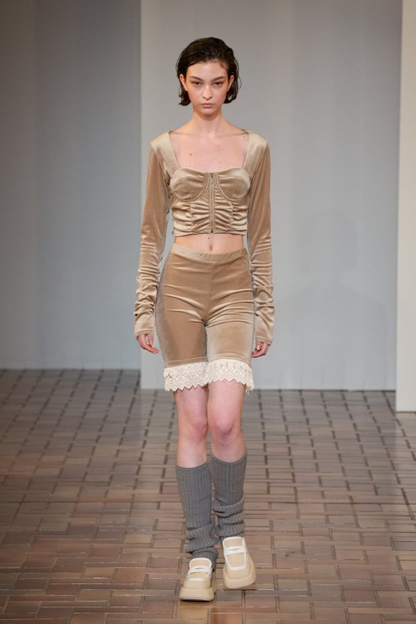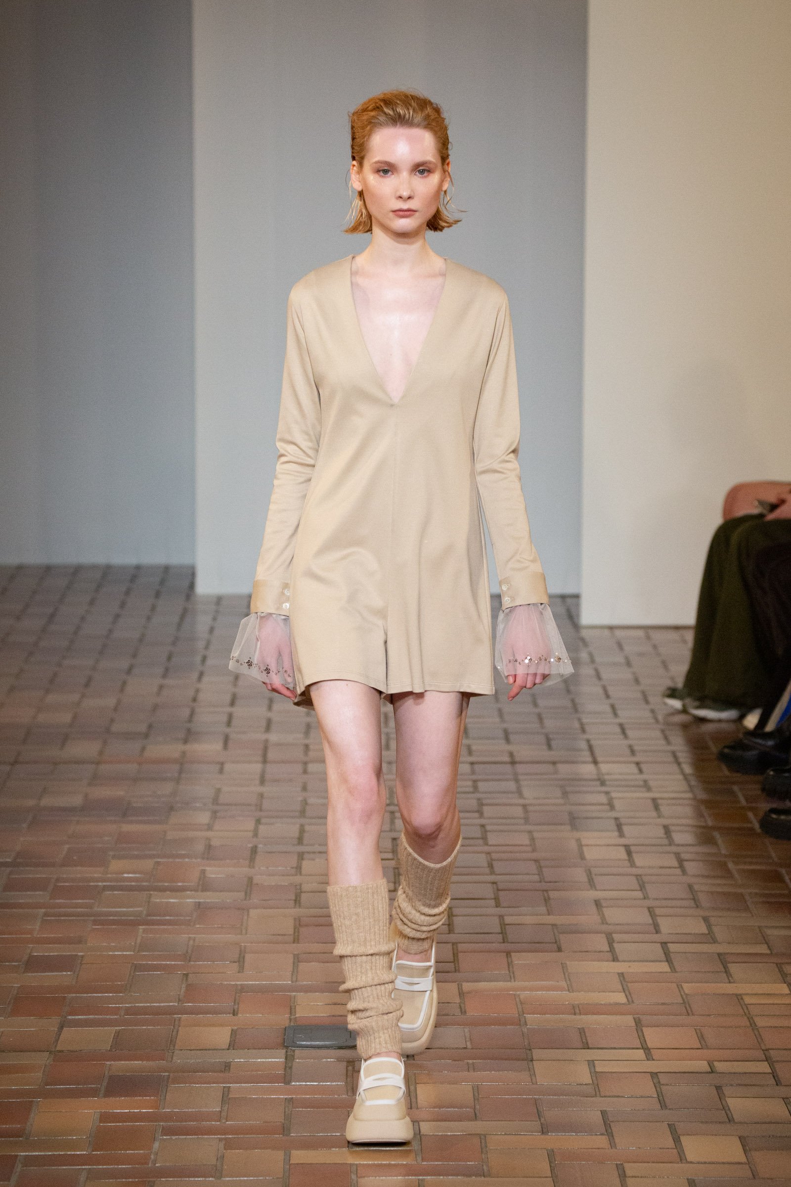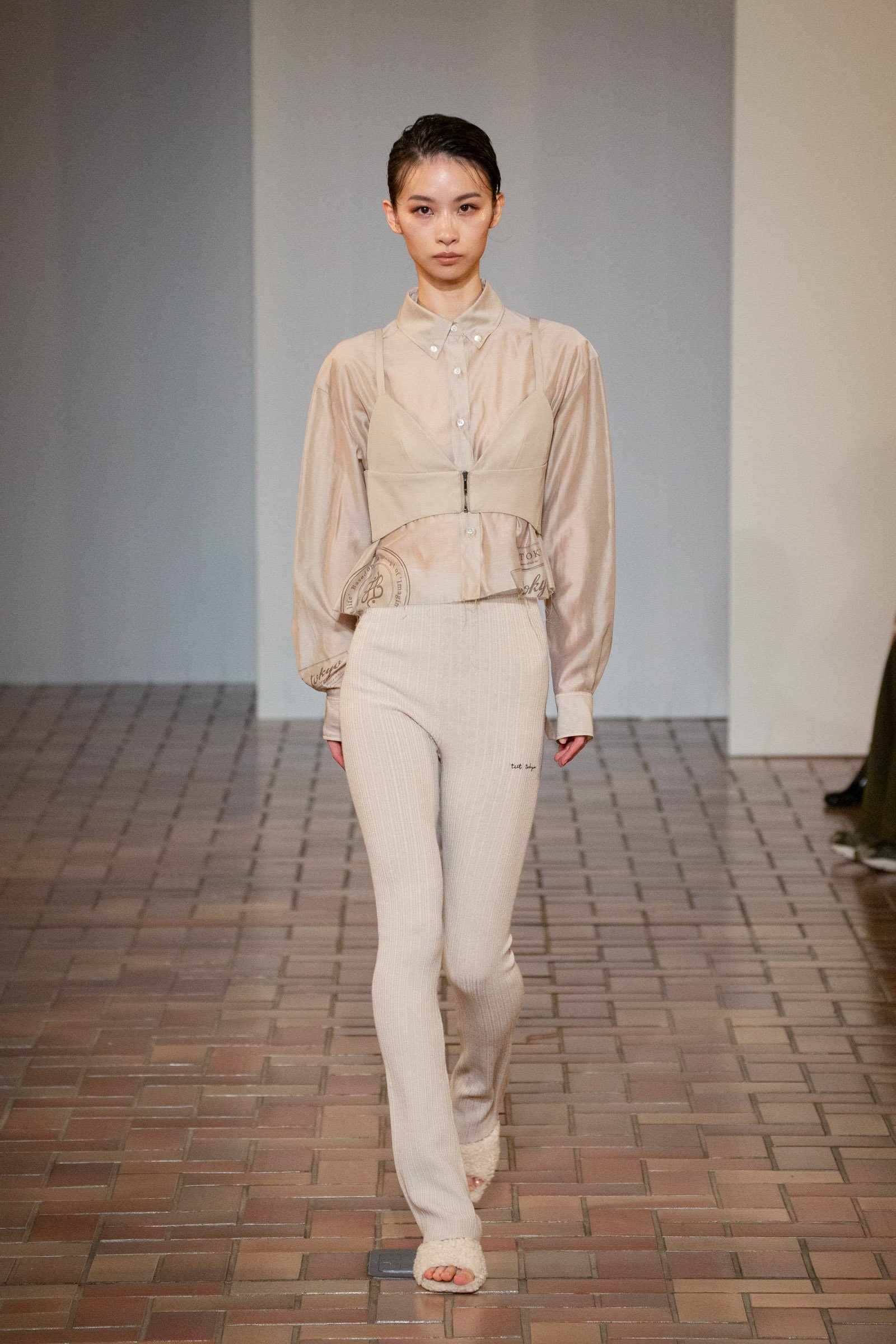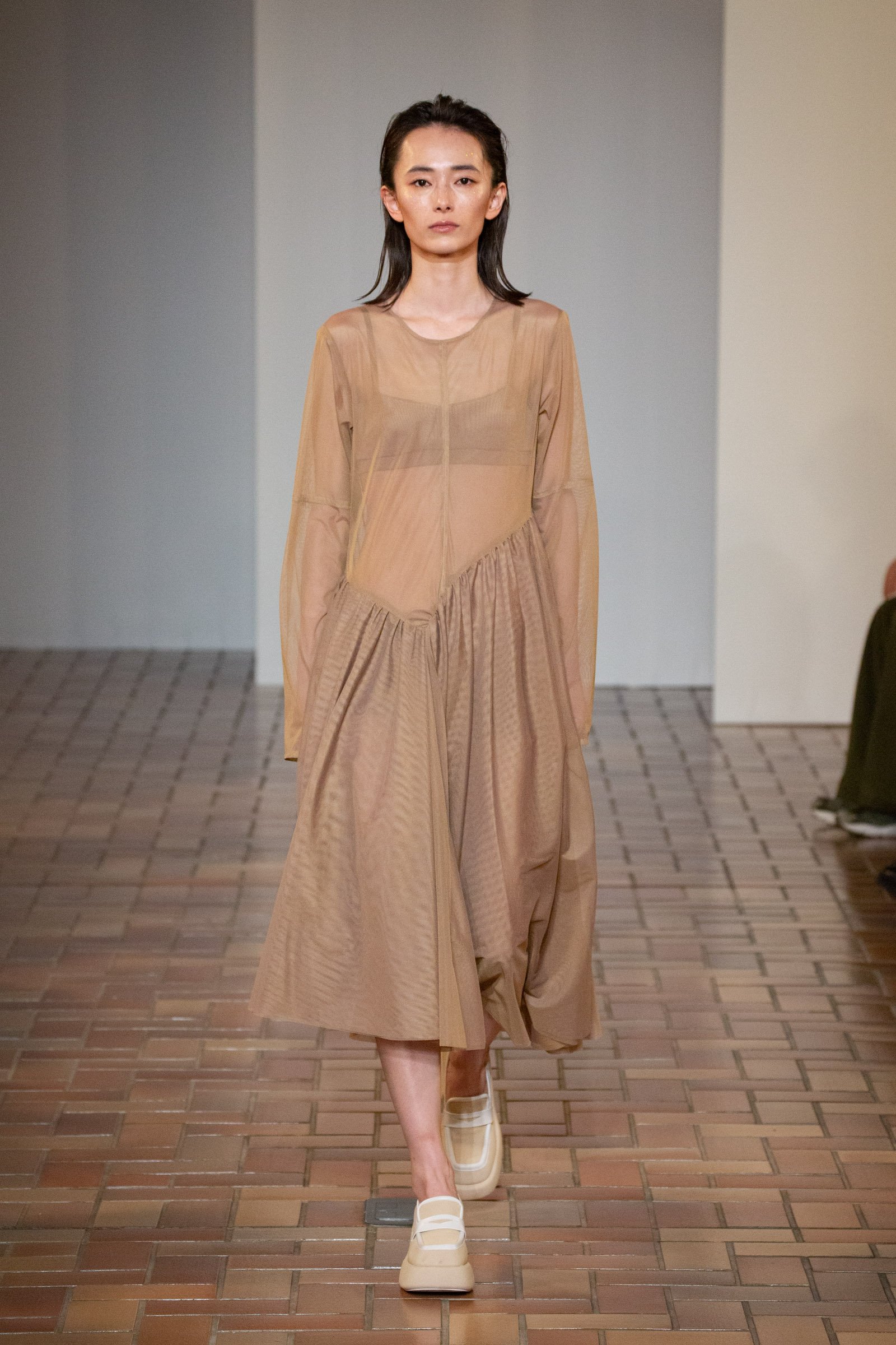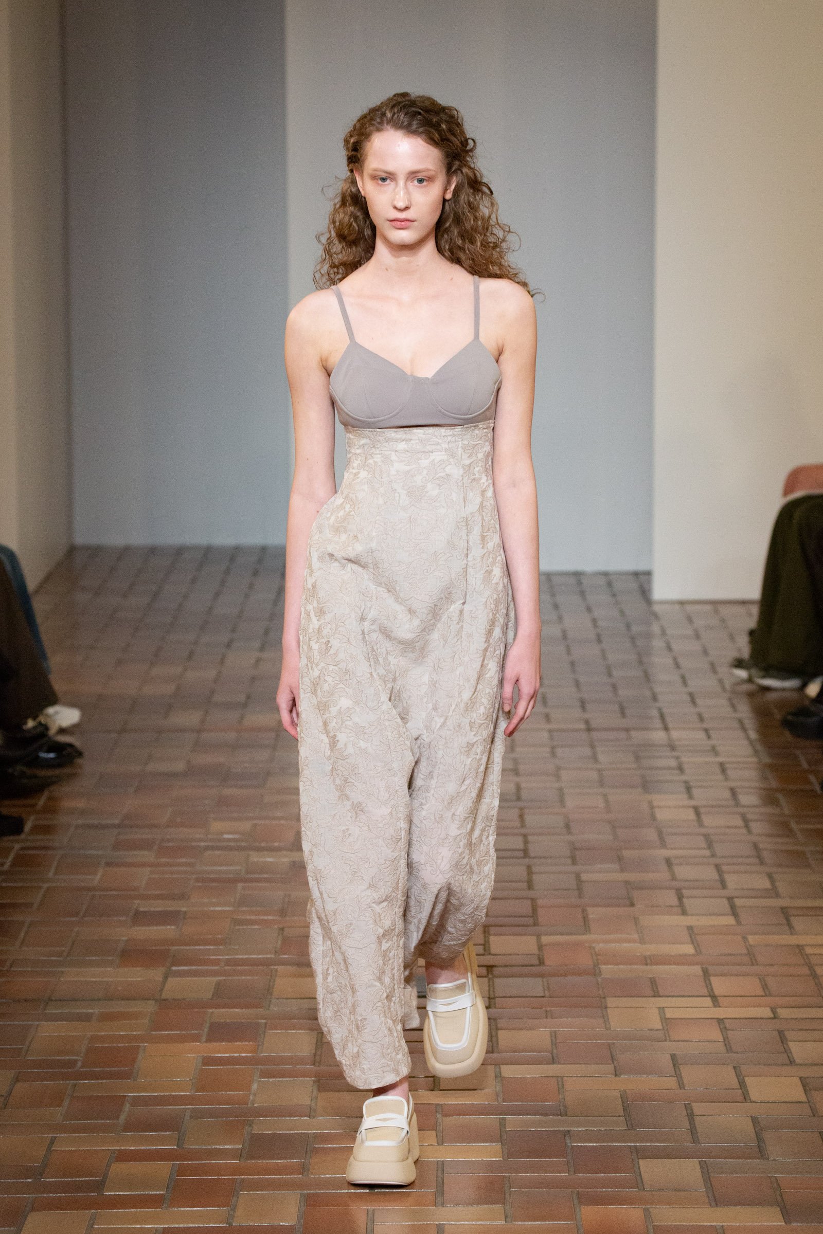モードの文脈から距離をとったことでより強固になったのは、スキンコンシャスへのこだわり。ヌードカラー中心だった2023年春夏シーズンよりも、今シーズンはさらに限定されたトーンのニュートラルカラーで構成された。なぜ難易度の高いヌードカラーでまとめるのかといえば、それは肌の色に馴染み肌の美しさを邪魔しない色味だけで作ることに可能性を見出しているからだ。そのためテキスタイルは、幅広いベージュの中から理想の色味を作るため、今まで以上に色出しにこだわったという。