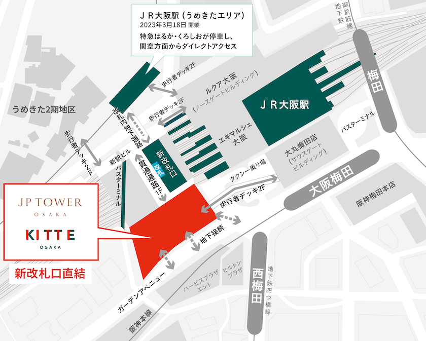 2024年3月に竣工予定の「JPタワー大阪」は、旧大阪中央郵便局跡地に位置し、商業施設「KITTE大阪」や演劇やミュージカルなど約1200席を設けた劇場、JR西日本ホテルズがマリオット?インターナショナルと提携した「オートグラフ コレクション」ブランドのホテル、約4000平方メートルに及ぶオフィス空間が設備された大型の複合施設だ。「つなぐ」を本計画のコンセプトとしており、3月に整備されるJR大阪駅新改札口、既存の連絡橋口改札、西梅田地下歩行者道路「ガーデンアベニュー」など、利便性の高いアクセスを実現させた。