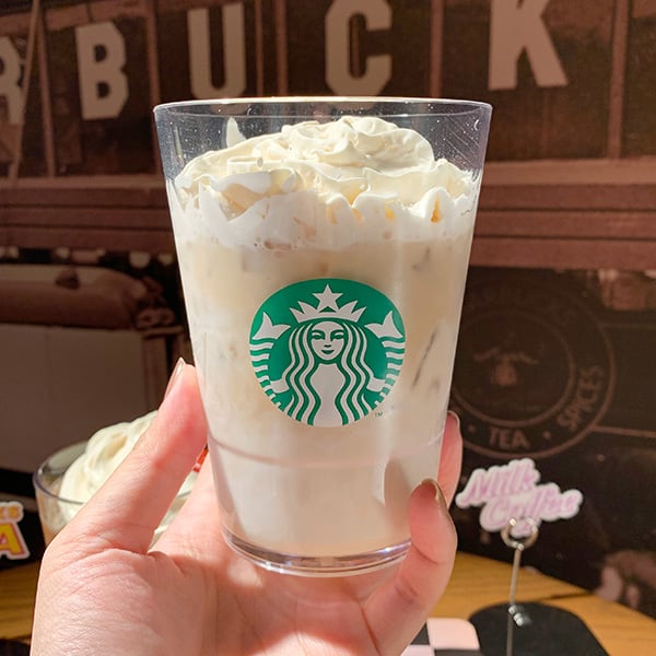 ベースの『バニラミルクコーヒー』を挟み、底部分には『フレッシュクリーム ホワイトモカフレーバーシロップ』が、トップにはフラペチーノと同じ『バニラコーヒーホイップクリーム』が乗せられています。