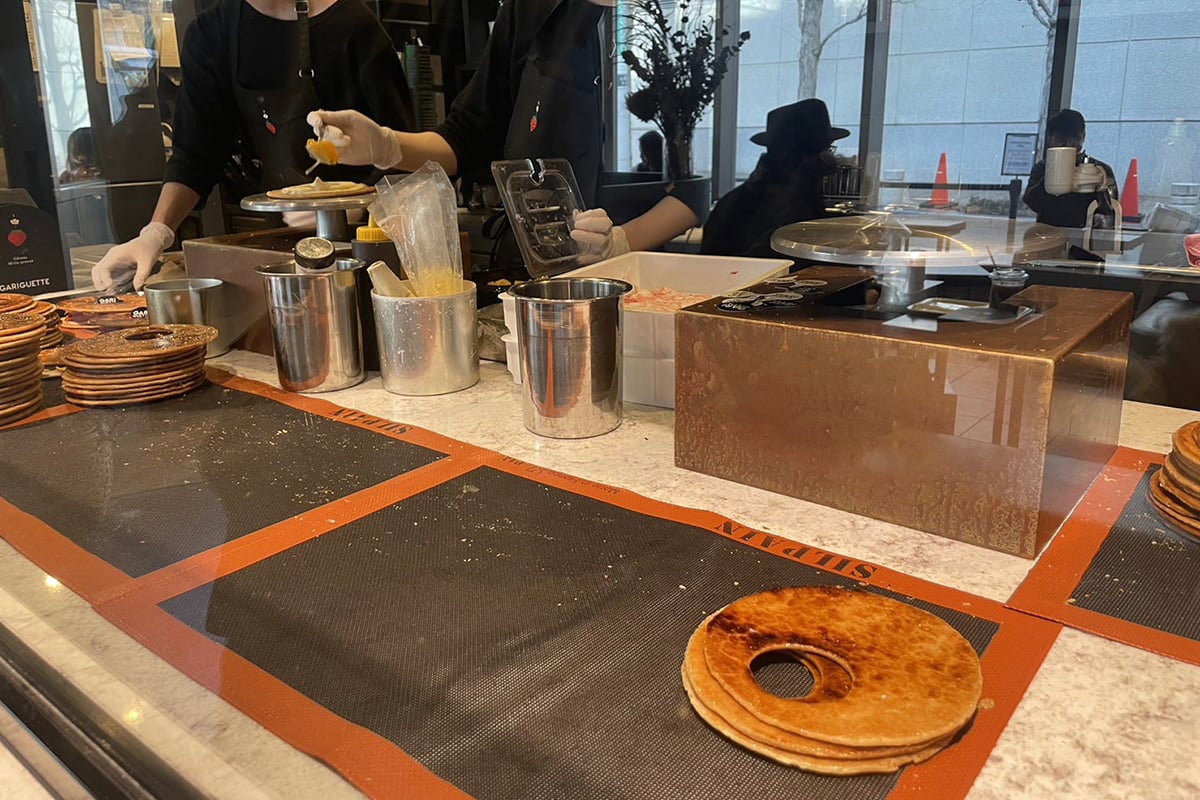 店中に立ち込める香ばしい匂いは、子どもの頃に胸躍らせた近所の洋菓子屋さんを彷彿とさせる。当店のミルフィーユケーキ「ミルプレッセ」が、焼き上がっていく過程を間近で見られるのも楽しい。