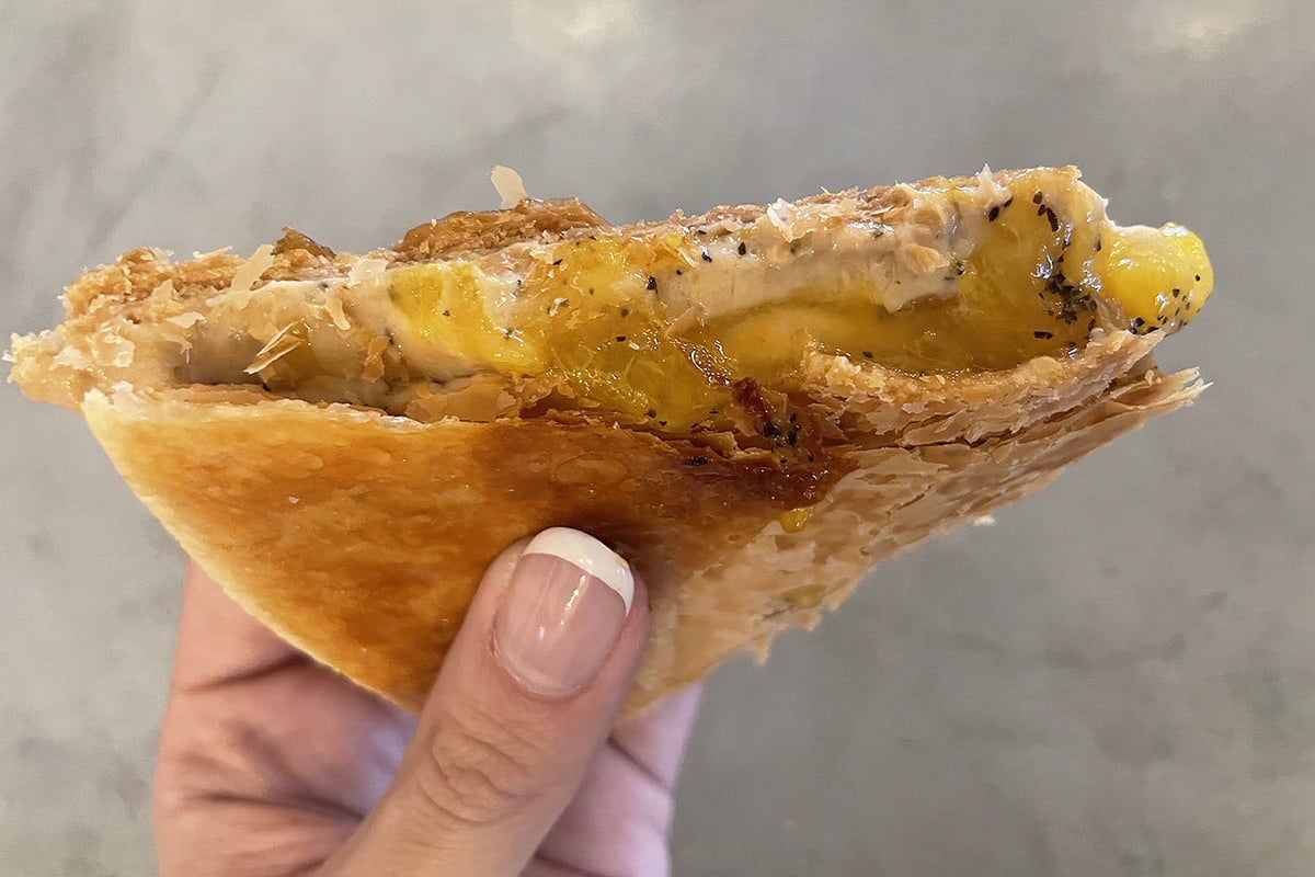 両手でしっかり持って、頭のほうからガブリ。バターが香るサクサクのパイ生地に、甘酸っぱいアプリコットコンポートと、上品なアールグレイクリーム。口いっぱいに広がる、高級ミルフィーユケーキの味わい。これはまさに、ホールケーキの丸かじりだ。