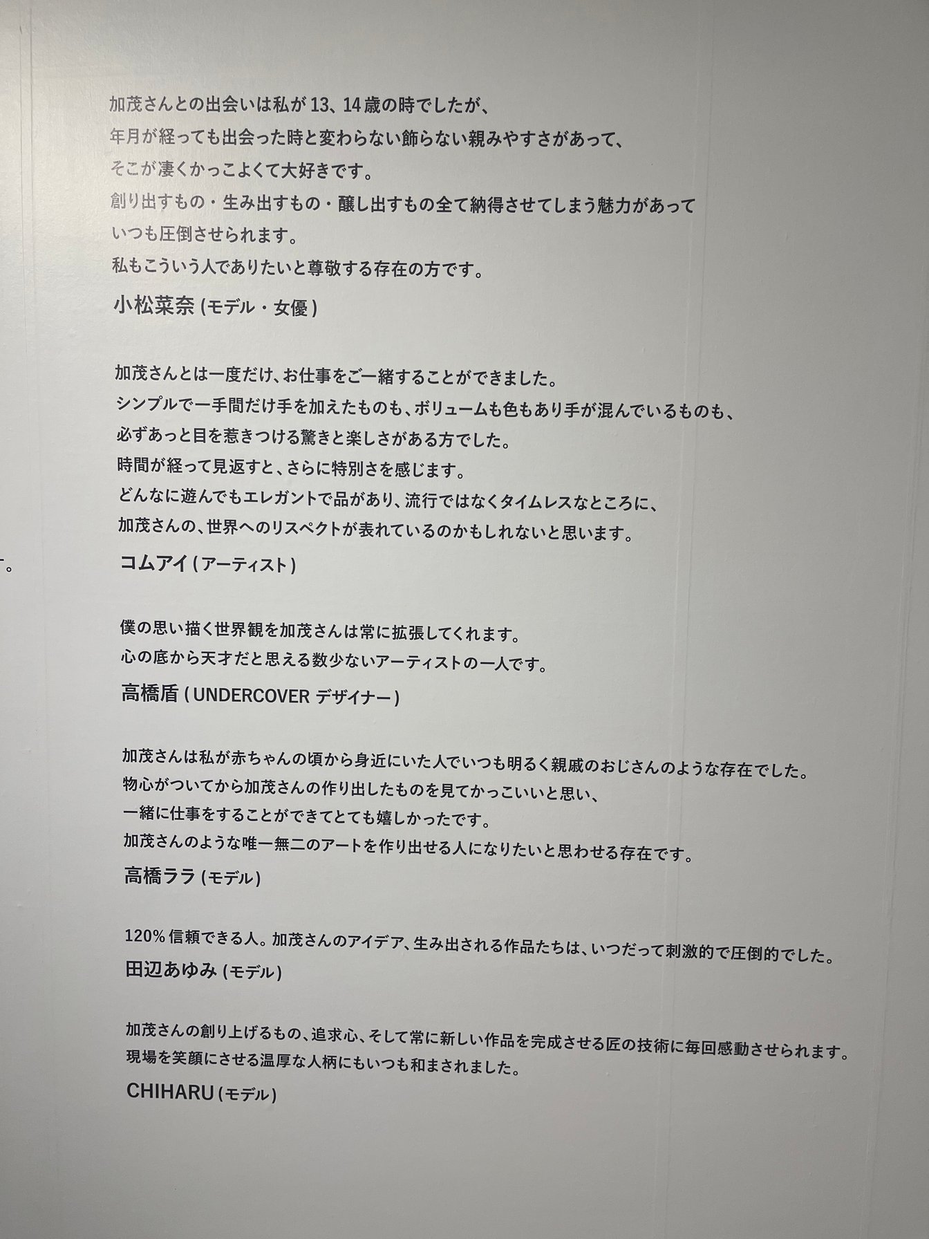 物販コーナーでは、作品集「KAMO HEAD」と「100 HEADPIECES」の販売に加え、2019年3月に加茂が出演したNHK番組「デザインあ」を放映。また、加茂と親交のあった著名人として、モデルで女優の小松菜奈や、アンダーカバーのデザイナーの高橋盾などのコメントを展示している。