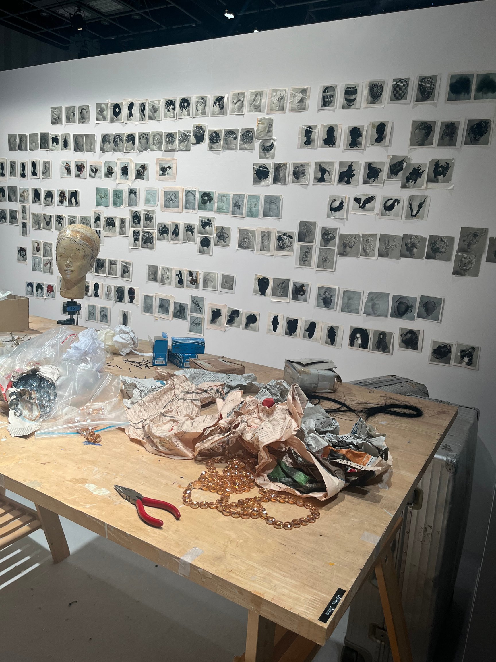 加茂のアトリエを再現したスペースには、実際に使用されていた机やソファ、小物を配置。アトリエには過去作品をまとめたポラロイドブックも用意し、来場者は自由に鑑賞することができる。壁に貼られたポラロイド写真は、実際の並びを可能な限り再現しレイヤードしたという。