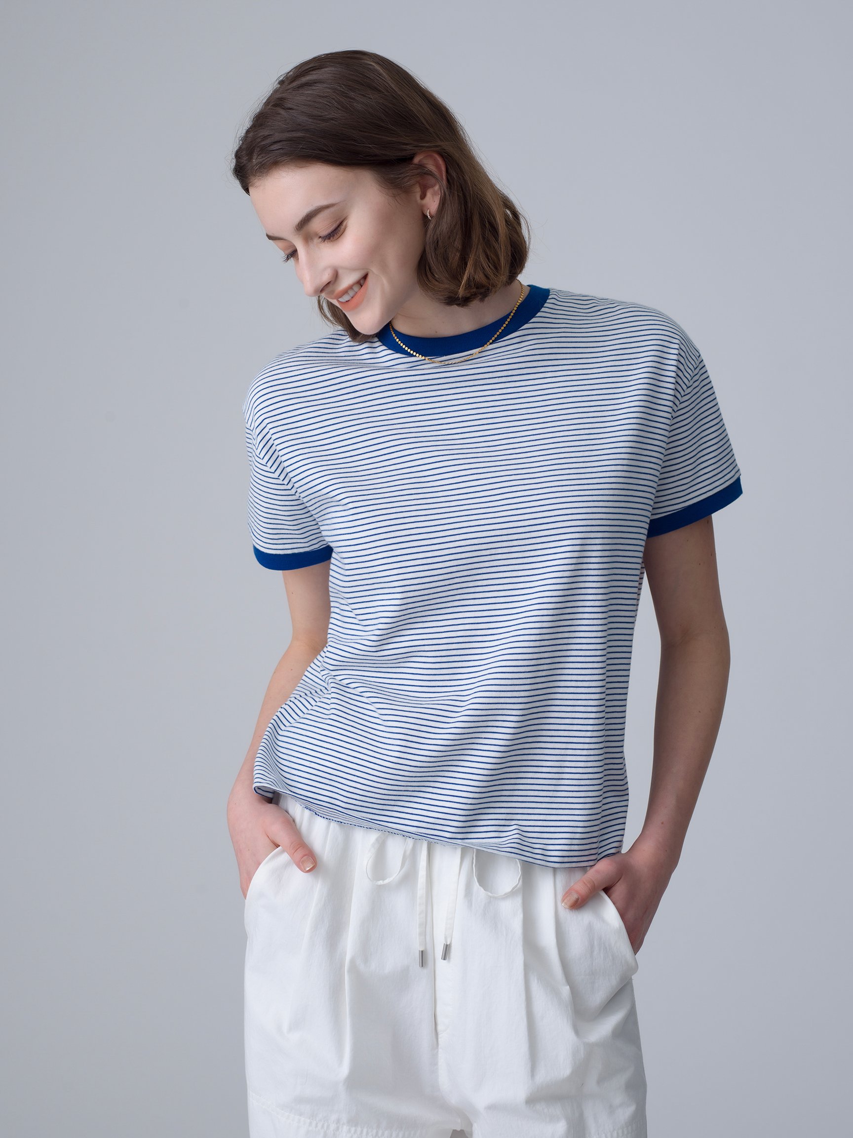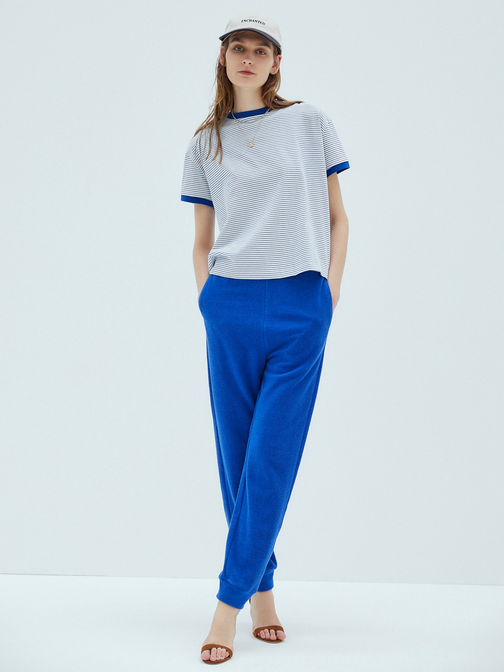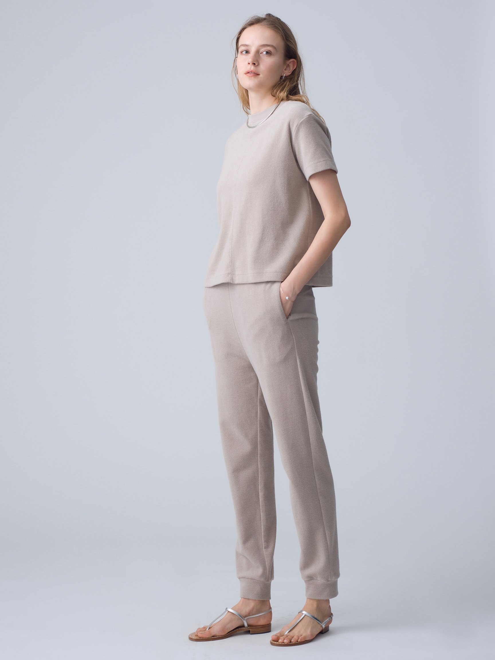 アイテム第1弾では、アフリカのサンビア中央州に住む契約農家100人が育て、2022年春に収穫された綿花を使用。トレーサビリティに配慮した上で日本に輸出し、ロンハーマンの工場で紡績した。天竺のスウェットプルオーバー(2万3100円)、スウェットパンツ(2万5300円)、セットアップで着用できるパイル生地の半袖Tシャツ(1万4300円)とパンツ(2万3100円)、無地とボーダー柄のTシャツ2型(各1万4300円/いずれも税込)をラインナップする。