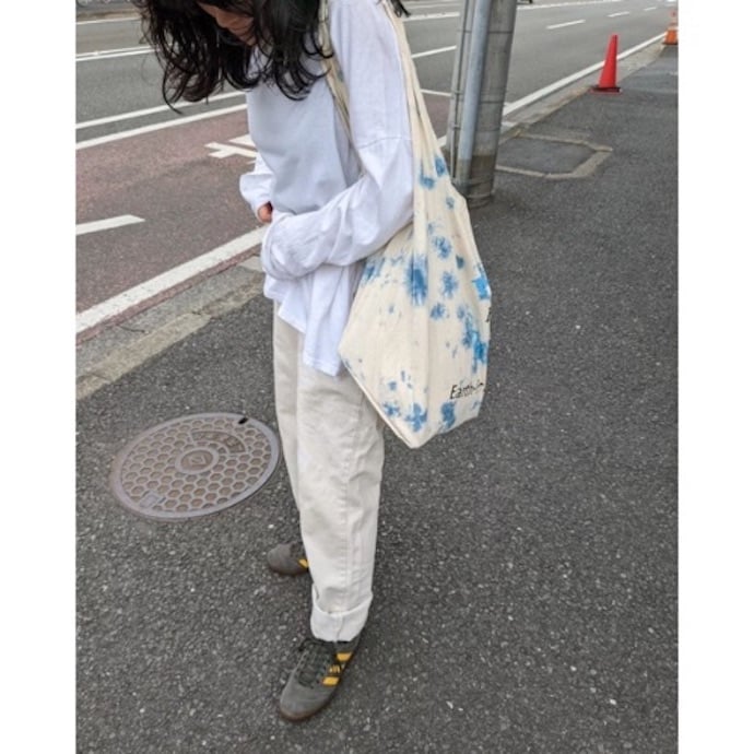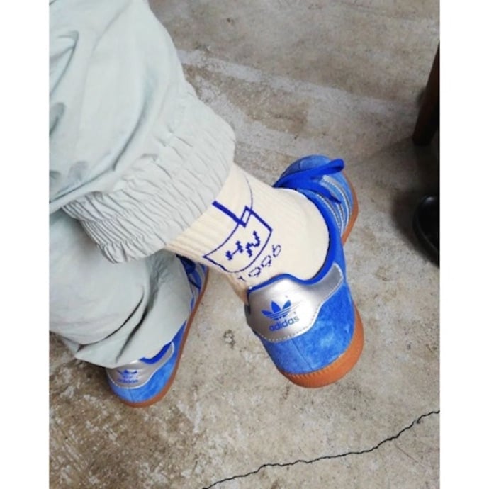 続いて紹介するのは、鮮やかなブルーにシルバーラインが映えるスニーカー。目が覚めるようなブルーのシューズのときは、全体を淡い配色でまとめて、足元に重心をもってくると◎です。