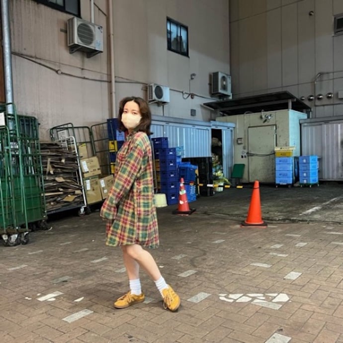 最後にご紹介するのは、イエローのスニーカー。同系色のチェックシャツと合わせたコーデは、90年代ファッションを想起させる配色でかわいすぎます。
