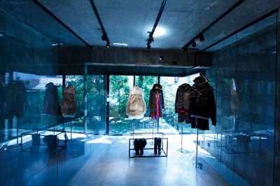 また、2階のフロアに登場した真っ赤な什器も、「空間に線を引く」という関の象徴的なデザインを反映したもの。そのほか、照明として取り入れられた天井のLEDパネルや、段ボールに石膏を詰めて作られた四角い什器、「マレンコ(MARENCO)」のウレタン製ソファなどもユニークなアクセントを加える。床に部分的に敷かれたヴィンテージのペルシャ絨毯は、無機質なコンクリートとのコントラストを生み出していた。