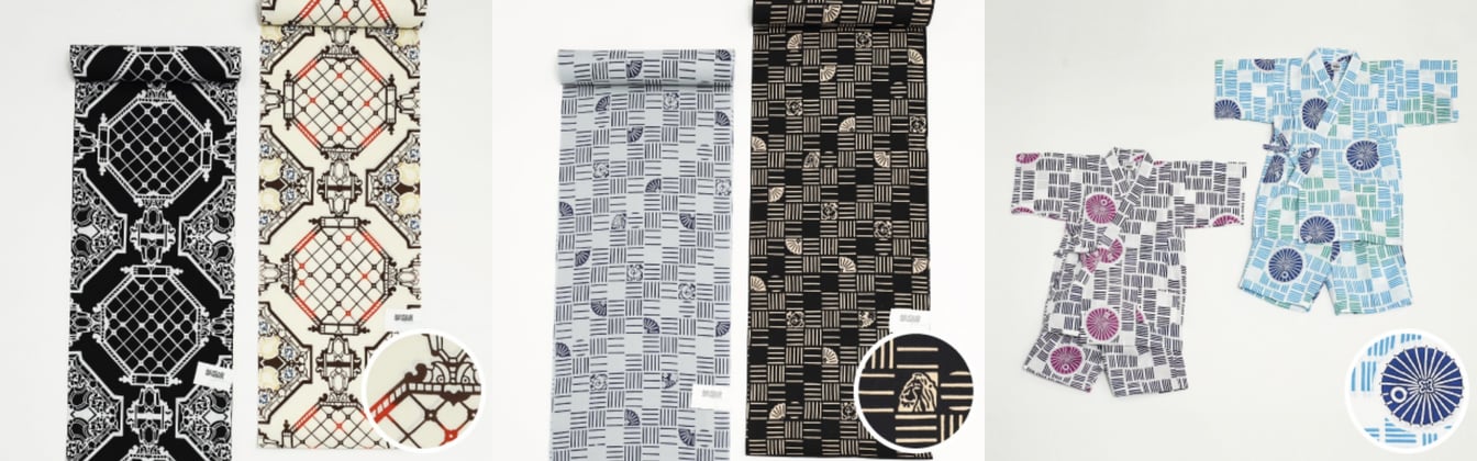日本橋本店本館4階の呉服フロアでは「ゆかたでアソボ」をテーマに、日常生活で楽しめる浴衣を提案。昭和2年に作られた三越劇場の天井ステンドグラスの柄をあしらった婦人浴衣地「ステンドグラス」(2色展開、3万8500円)や、「三(みつ)」「五(こ)」「四(し)」になぞらえてデザインされた3本?5本?4本の「三越縞」に加え、アンモナイトや番傘、ライオン像といったモチーフを市松模様で落とし込んだ紳士浴衣地「市松に隠れライオン」(2色展開、3万8500円)、越後屋の番傘貸しに着想を得た「石畳と番傘」(子ども甚平 5500円?、婦人浴衣地 3万8500円)を販売している。