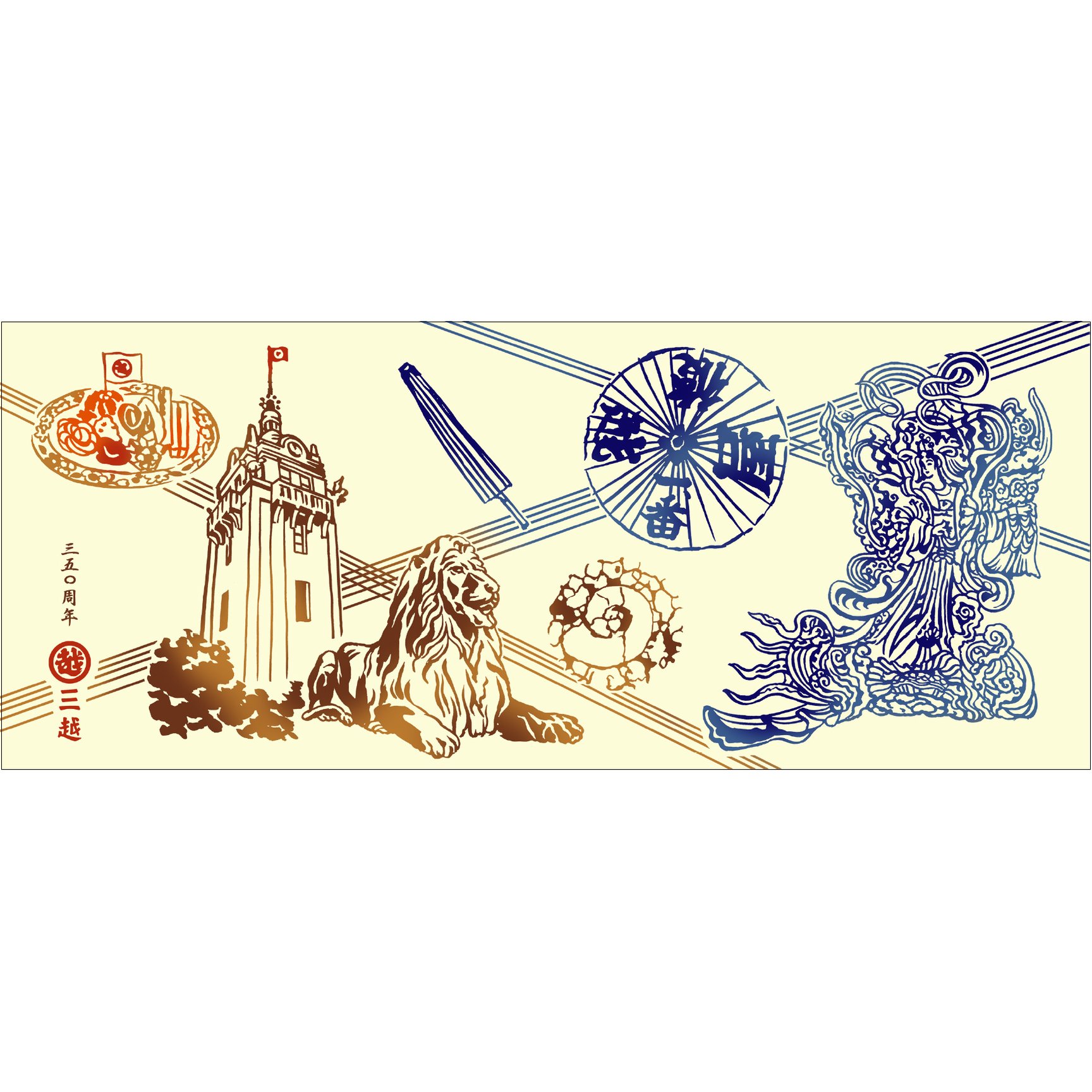 手ぬぐいでは、森口邦彦の作品が用いられた現在のショッピングバッグの柄を手ぬぐい用にアレンジした「実り」(2750円)、三越のラッキーナンバーと2013年まで使われていたショッピングバッグ3色を用いた「七五三縞」(1760円)、三越のシンボルを詰め込んだ「三越由縁」(1760円)の3柄を用意。「三越由縁」は好評で完売状態だといい、4月25日ごろに再販を予定している。