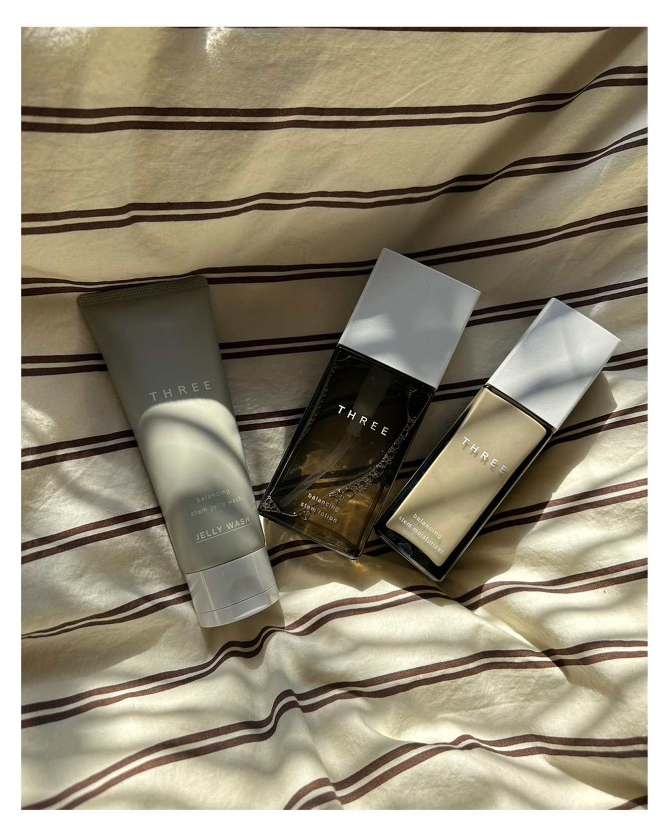 〈左〉バランシングステム ジェリー ウォッシュ(自然由来指数91%) 100g ?4,290 〈中〉同 ローション(自然由来指数92%) 120mL ?5,940 〈右〉同 モイスチャライザー(自然由来指数96%)80mL ?7,260 /すべてTHREE