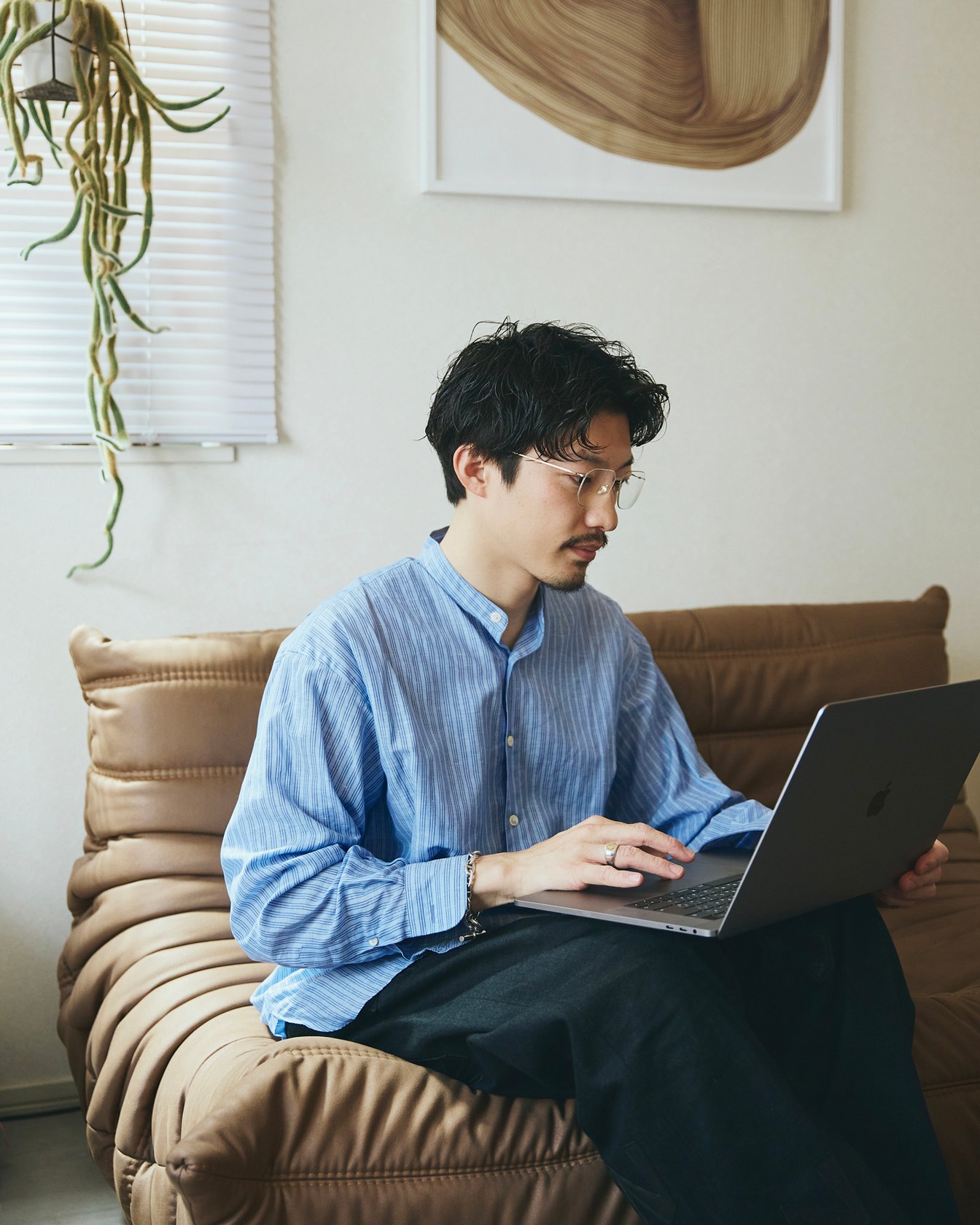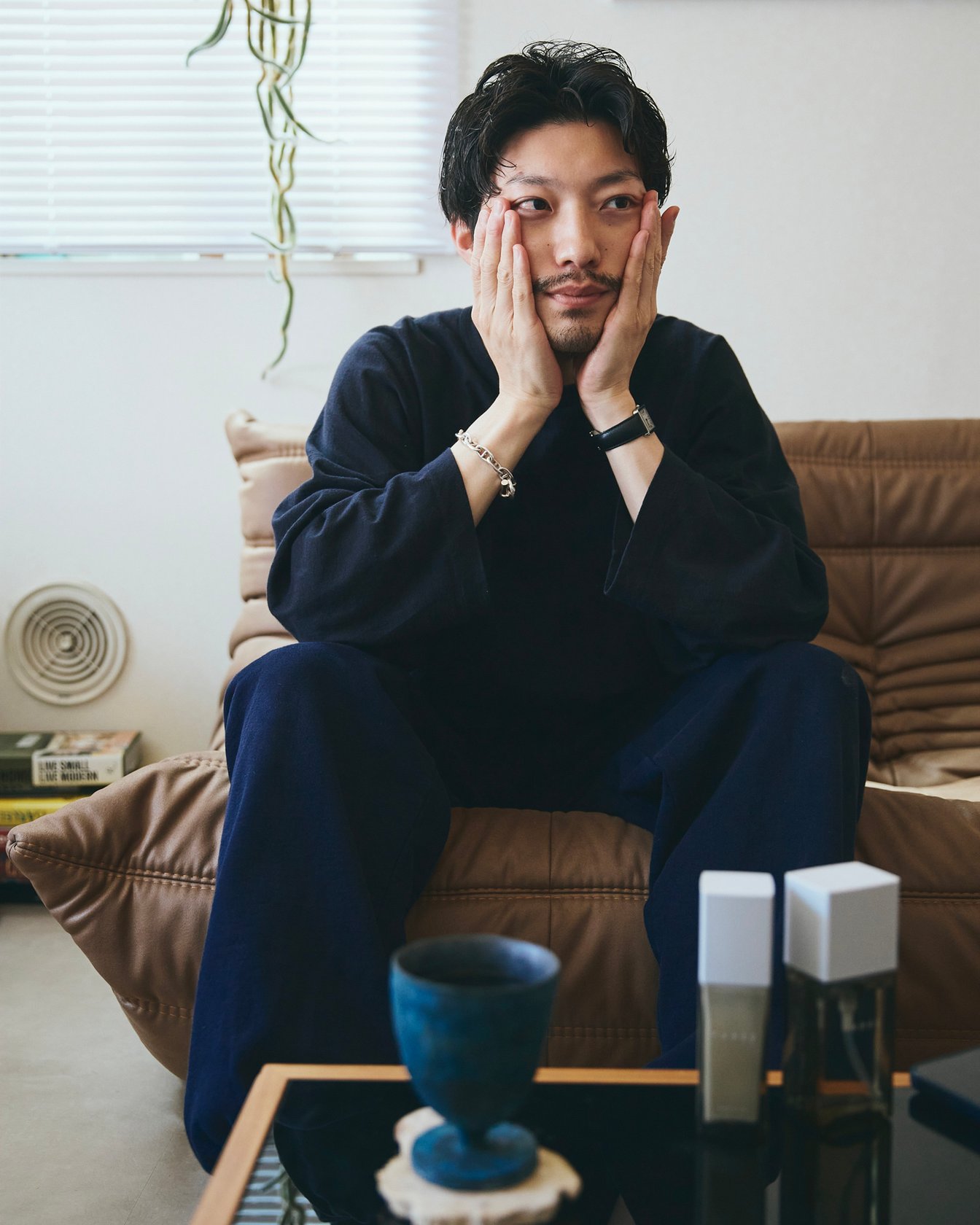 お気に入りの「リーン?ロゼ」のソファに座って、お気に入りのプロダクトでスキンケアをする。上質なものや好きなものにかこまれて普通のことをするって、すごくいいなと思います。そんな気分の余韻を感じつつ、ここでYouTubeやインスタグラムの動画編集を行ったり。動画の編集って夜やるイメージが強いと思いますが、僕は朝にやることも多く、夜よりも短時間で作業が進みます。