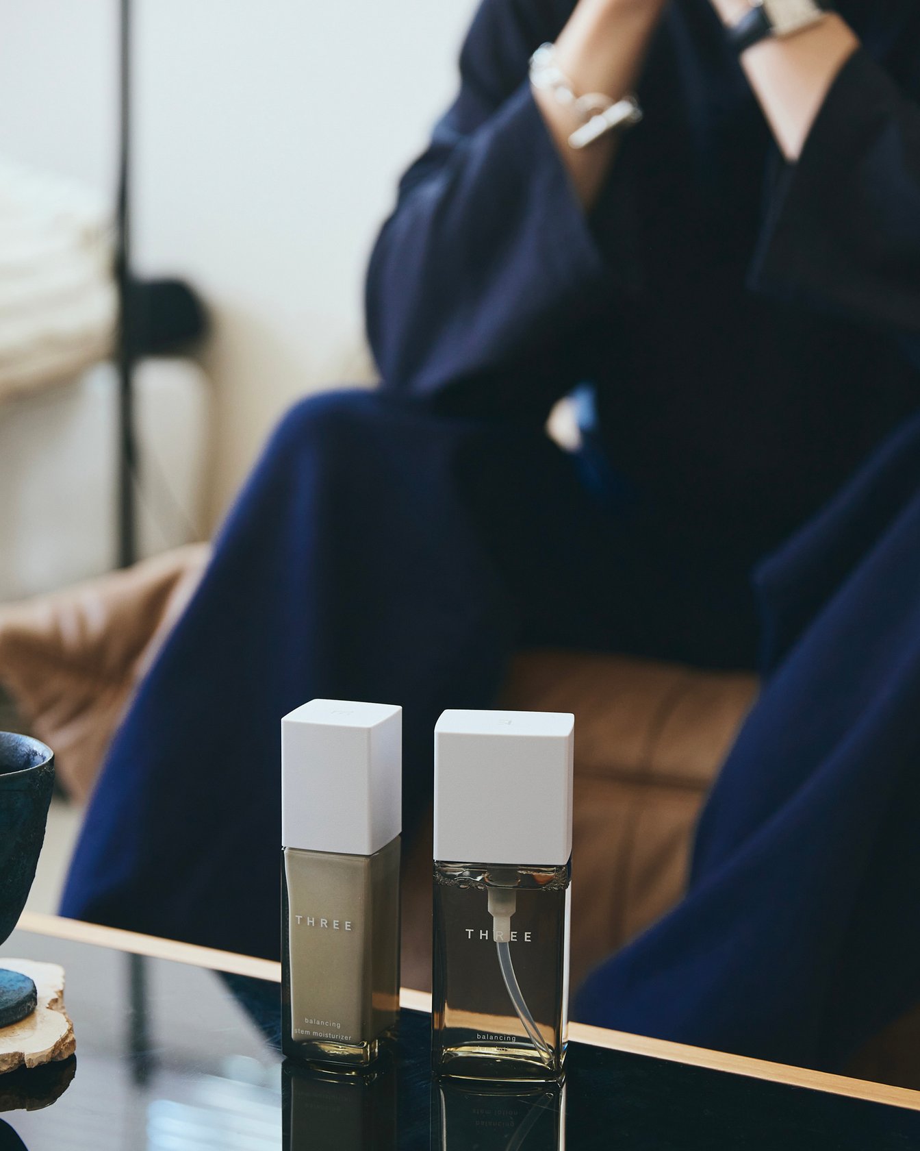このソファに座って、水を飲みながら化粧水と乳液でミニマムな保湿をしています。化粧水「バランシン?グステム?ローション」と乳液「バランシングステム?モイスチャライザー」から感じたのは、“余韻”。ハー?ブの香りが上質で、爽快感がありつつもその後に心地よさの余韻が続いていく。みずみずしいテクスチャー?としっかり潤う感じも含めて、とても気持ちいいです。このミニマムなデザインも柔らかなニュアンスがあ?って、男はもちろん、女性が使っていても違和感がないのがいい。