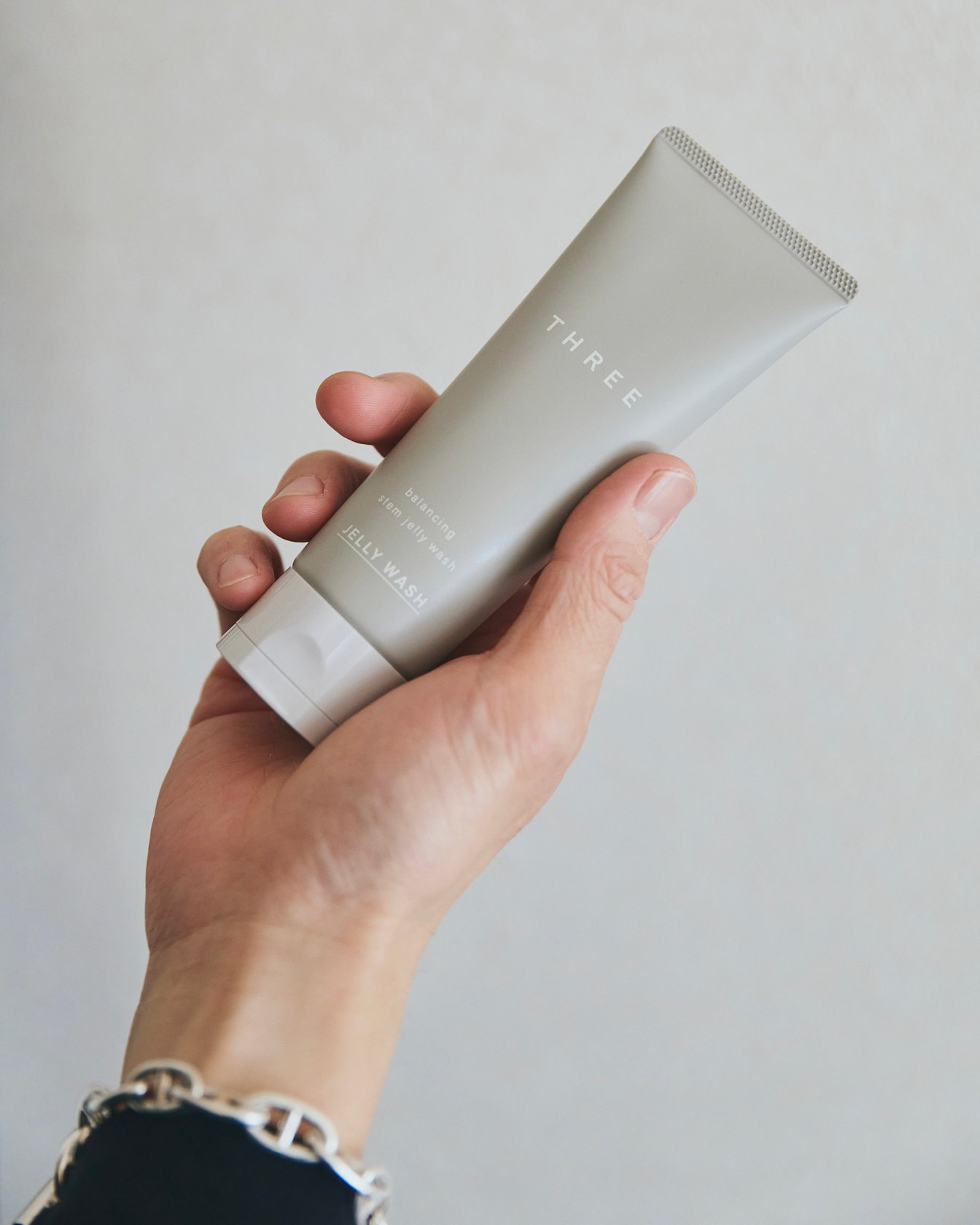 植物性スクラブ入り、寒天ジェリー処方の洗顔料。新感覚の泡だて不要なジェルテクスチャーで、使い続けることでごわつきが軽減。セイヨウナシ果汁発酵液*が角質をやわらかくする。バランシングステム ジェリー ウォッシュ 100g ?4,290/THREE *乳酸桿菌/セイヨウナシ 果汁発酵液(保湿成分)