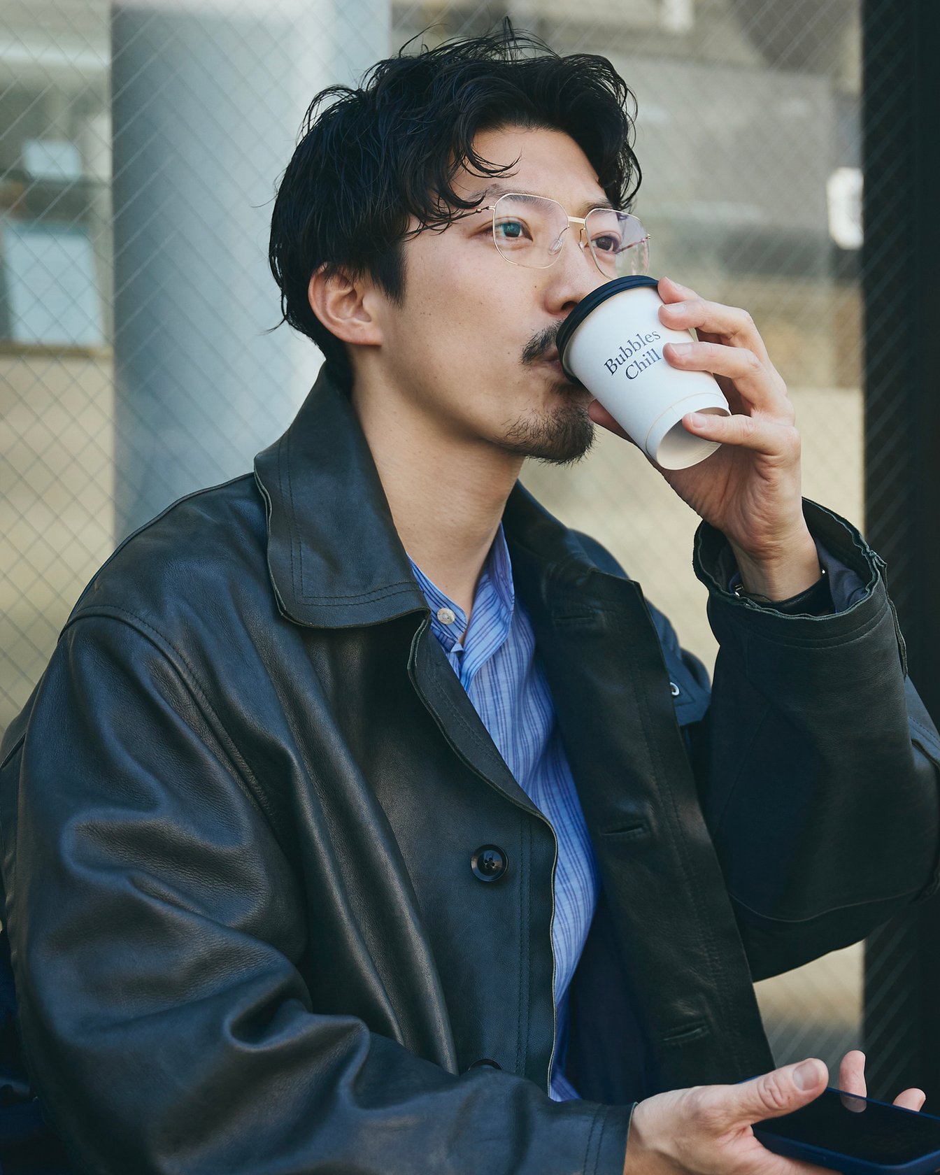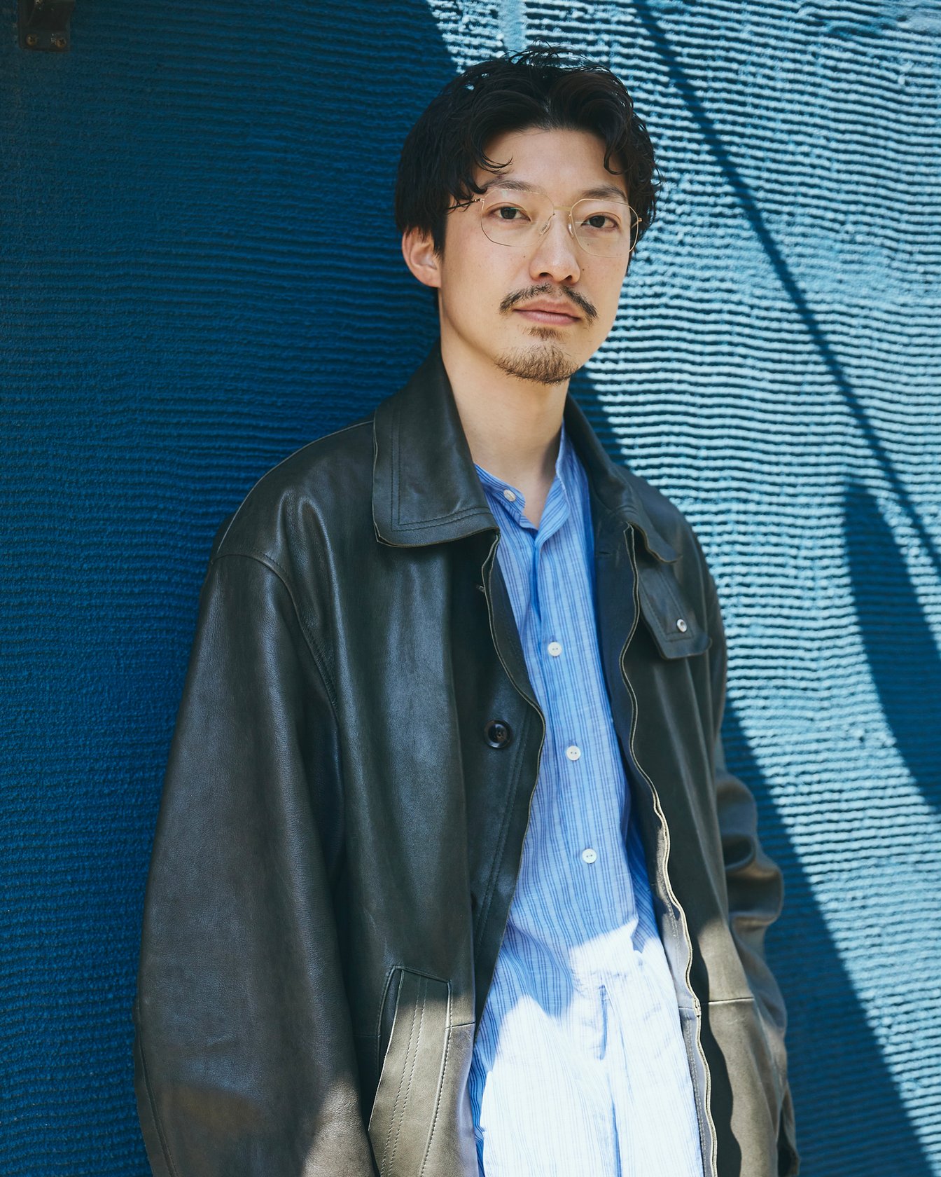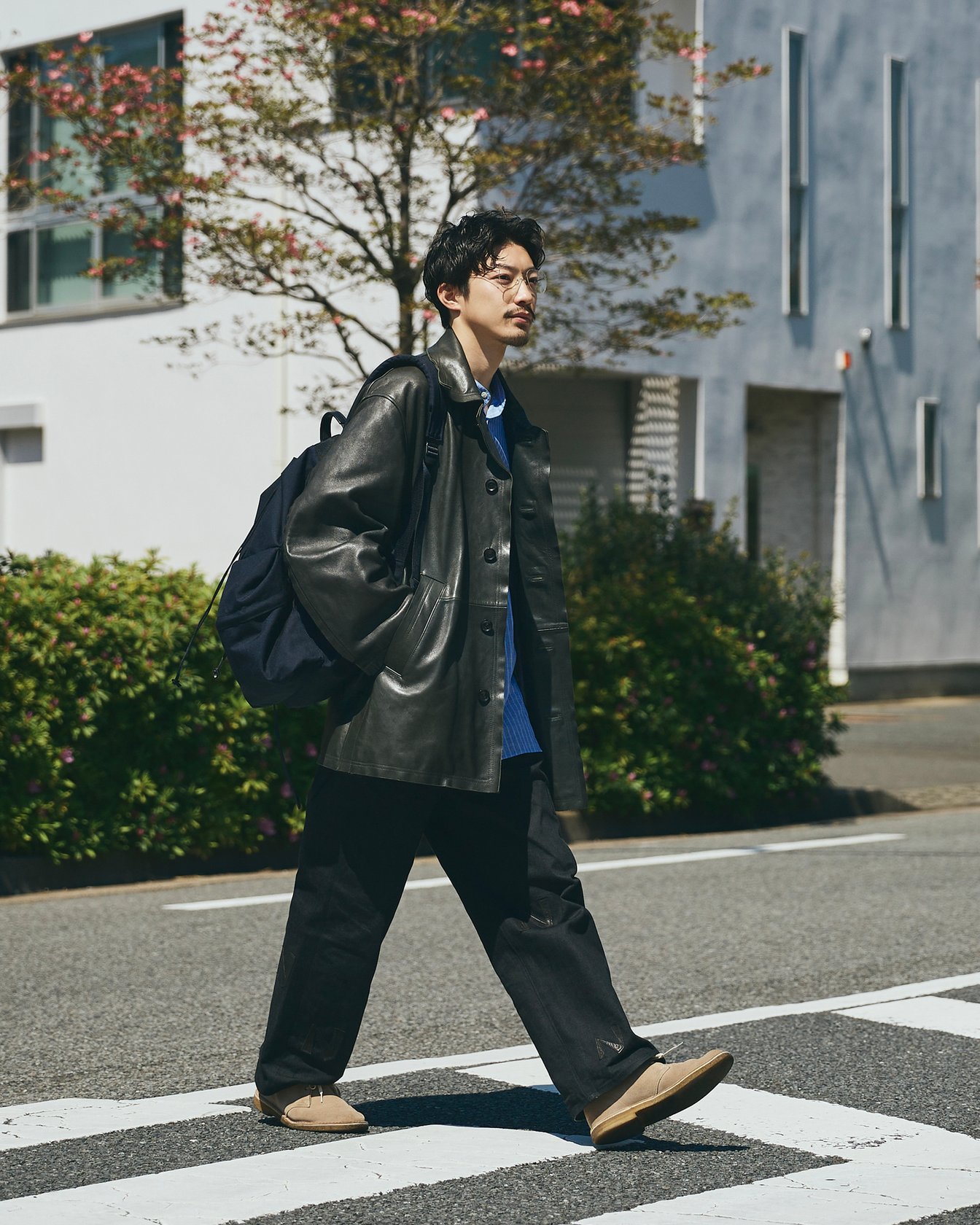 「ヨーク」のレザージャケットに「ナイスネス」のデニムで出勤。