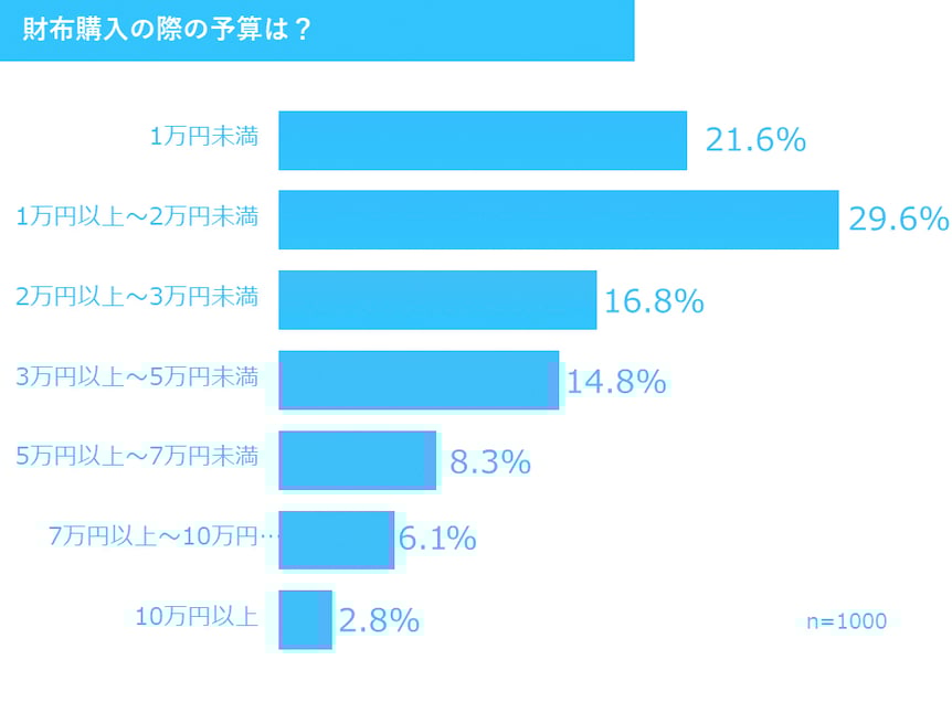 アンケート調査は全国の20代以上の男女1000人を対象にインターネットで行われた。財布を購入する際の予算で最も多かった回答は「1万円以上?2万円未満」、続いて「1万円未満」、「2万円以上~3万円未満」という結果になった。