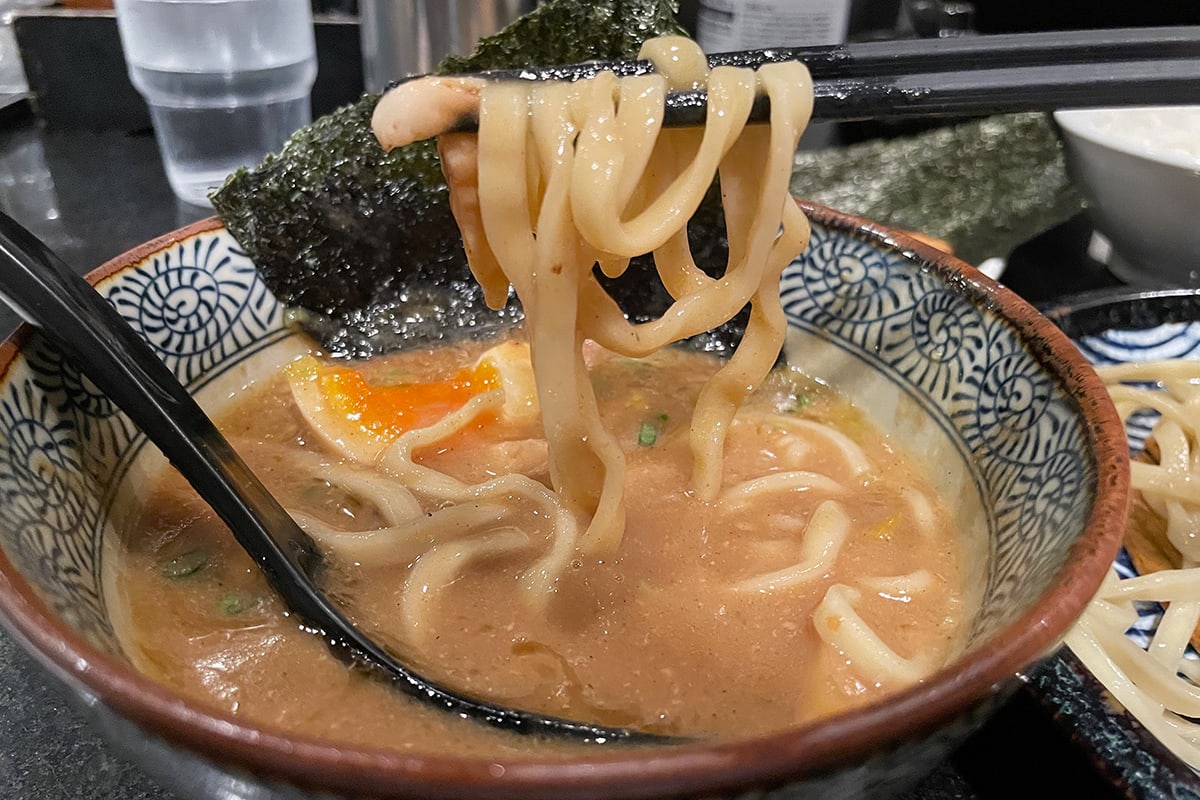 早速、熱々の汁に麺をダイブ。そしてリフト。モチモチの太麺に濃厚な魚介系スープがしっかり絡んで最高にうまい。ふんわり感じるゆずの風味が全体を上品にまとめている。