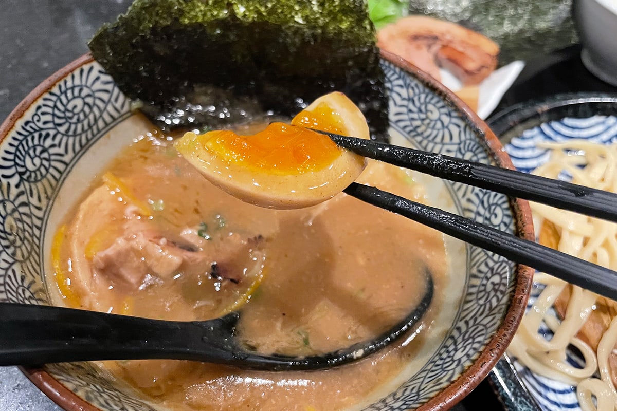 汁を吸った海苔や、半熟とろとろの煮卵も間違いない。濃厚魚介×鶏スープで知られる行列の絶えないつけ麺の名店、新宿の「風雲児」を彷彿とさせる美味しさ。この店、侮れない。というか、焼き鳥屋さんですよね?