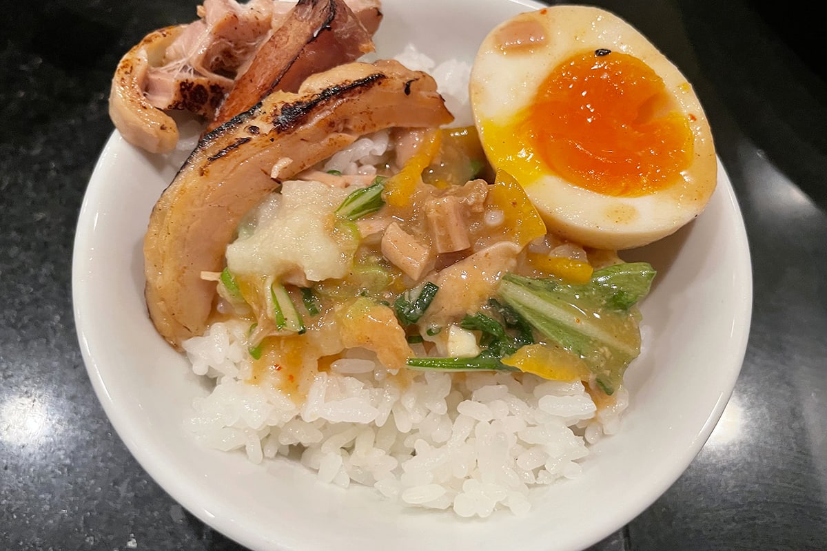 そしてお待ちかね。味染み煮卵とこんがりチャーシュー、そして残ったスープをかけ、おろしにんにくを添えてオリジナル丼のできあがり! ラーメンライスは言わずもがなギルティな組み合わせだが、これがとんでもなくおいしい。豆板醤をちょっと乗せたり、汁が浸った海苔に巻いて食べても◎
