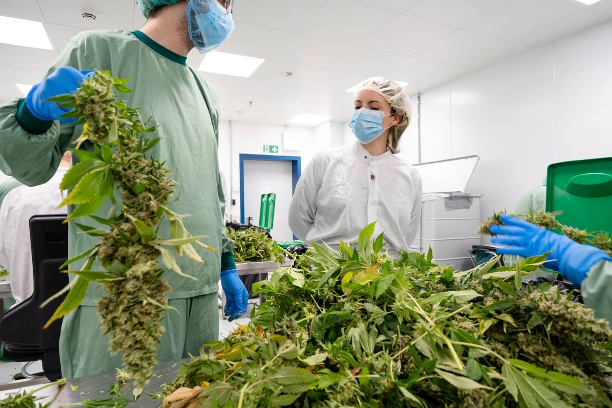 その後、エル?カディルは大麻愛好家なら喜びで胸がいっぱいになること間違いない3番目の部屋へと案内してくれた。この部屋に漂う匂いは、これまでの部屋とは比べ物にならないほど強烈だった。4つの金属のテーブルの上で、従業員が枝から花を外している。同社のベルリン支社で働くアルバイトの学生たちが、今日は臨時の補佐として手伝っていた。