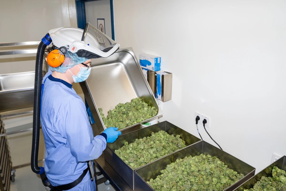 ミュラーと他のスタッフが収穫を終えたあとも、蕾にはまだ数枚の葉が残っていた。そこで次の部屋の刈り込み機の出番だ。耳の真横で岩を削っているような轟音を立てながら、刈り込み機は花に残っていた数枚の小さな葉を取り除く。大麻草の細かいほこりから身を守るため、この部屋の従業員は宇宙飛行士のような酸素チューブ付きのマスクを身につけていた。