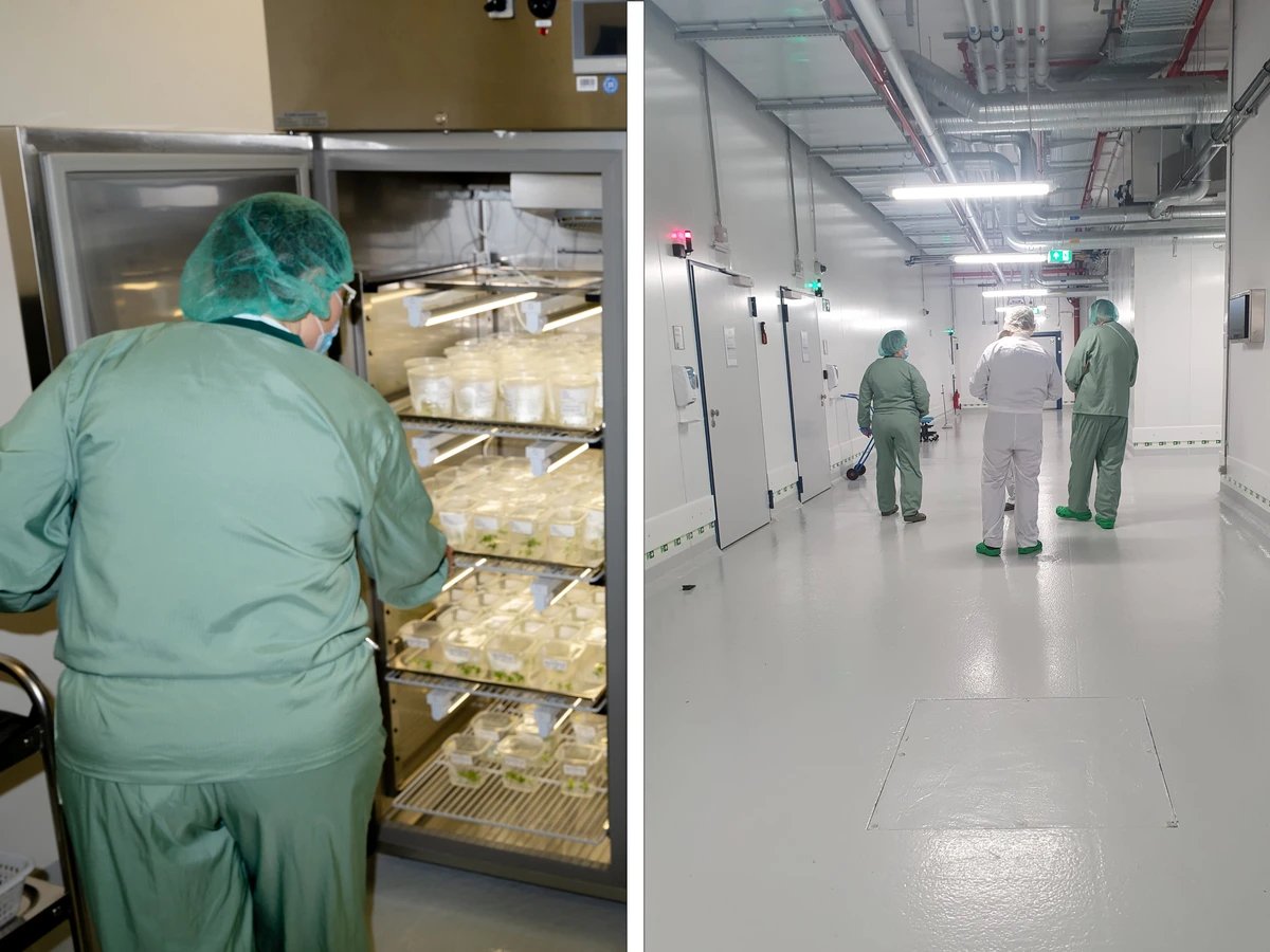 「まずは赤ちゃんから始めましょう」と彼はいい、今まで見たこともないほど巨大な冷蔵庫が置かれた部屋に入った。そこには食品の代わりに、プラスチックの容器に浮かぶ小さな大麻の赤ちゃんが入っていた。