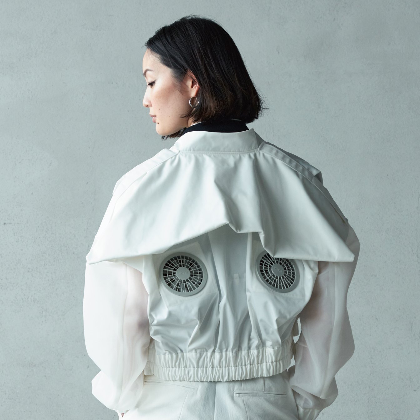 “Take Me Out”(以下TMO)というコンセプトで打ち出したシグネチャーモデルで、「TMO ウィンドブロワー ジレ」、「TMO ウィンドブロワー MA-1」の2タイプをご用意しています。作業用の空調服はすごく快適ですが、私服として着るにはお洒落ではありません。でも今の日本の夏は暑すぎて、普通の洋服ではとても外へ遊びに出かけられません。そこで送風機という技術とデザインを融合させることで外出に対するハードルを取り除き、「外に出よう、楽しもう、自分の可能性を広げよう」というコンセプトで開発しました。内ポケットに入れたバッテリーにコードを通し、背中のヨーク部分に装着したファンを回すことができるので、身体の深部体温の過度な上昇を防ぎ、夏の日々を快適に過ごすことができます。送風機をはずすと防風アウターとなり、3シーズン活用できるよう設計しました。