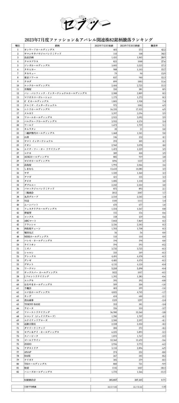 「セブツー」ではファッション&アパレル関連の82社について、ファッション&アパレル関連の82社について、毎月その株価の騰落率ランキングを発表している。今回は2023年7月度のランキングを発表する。