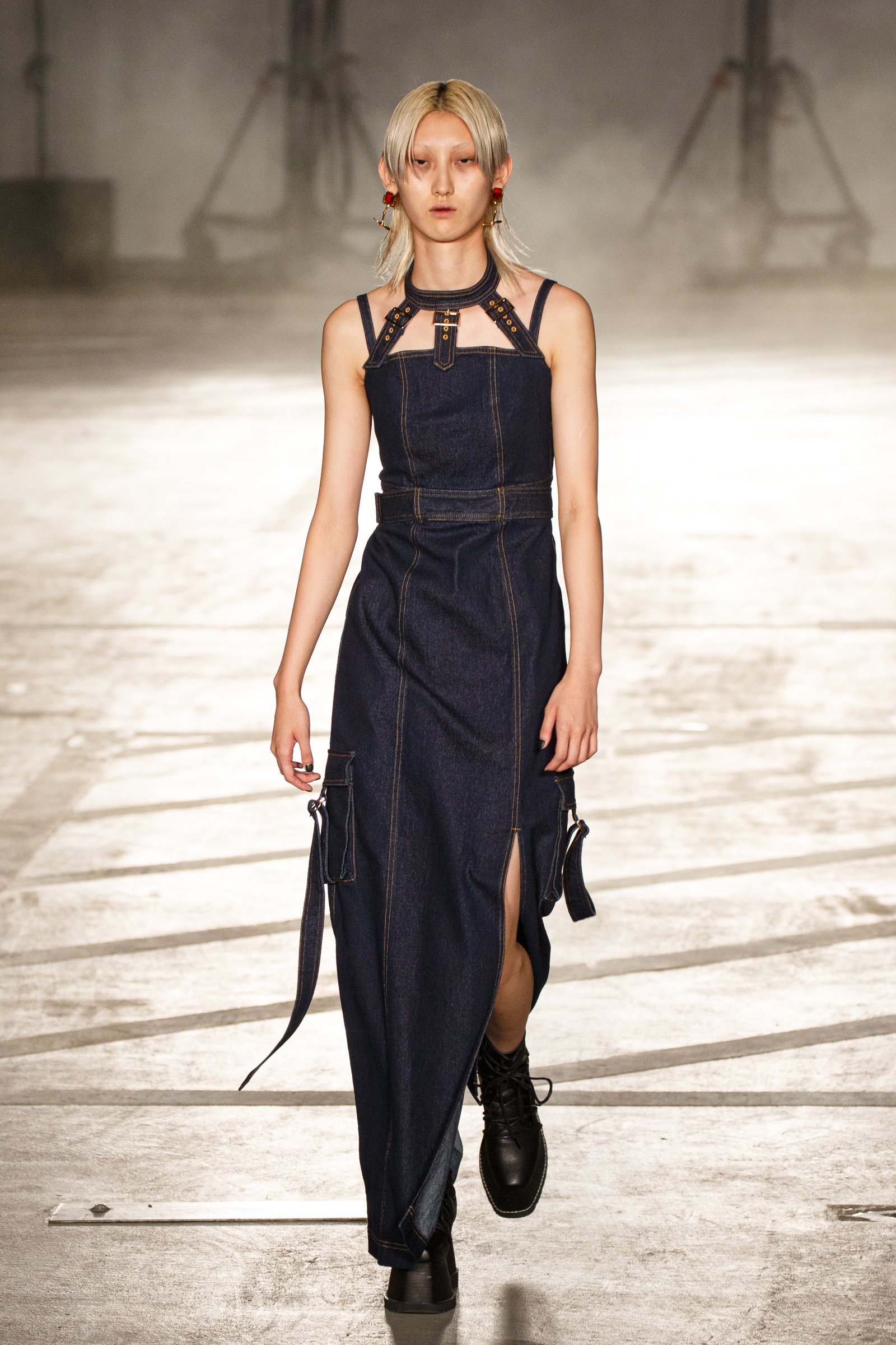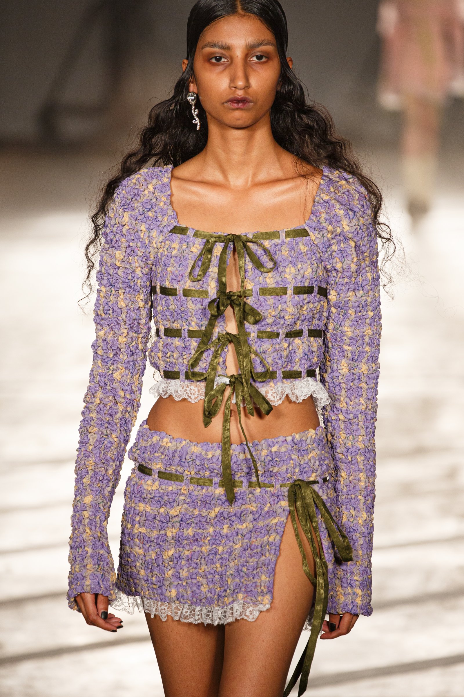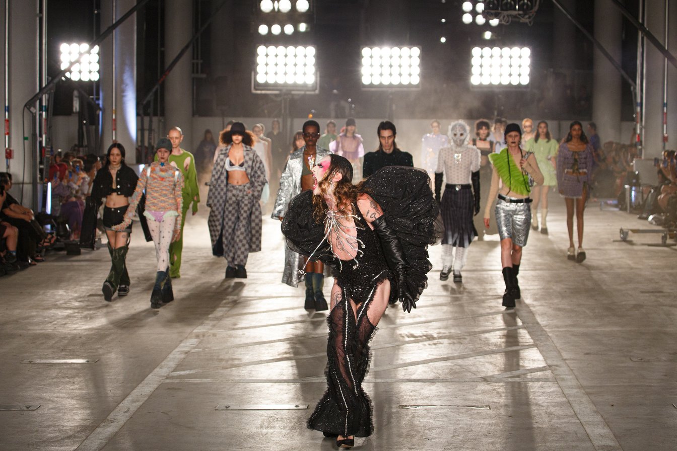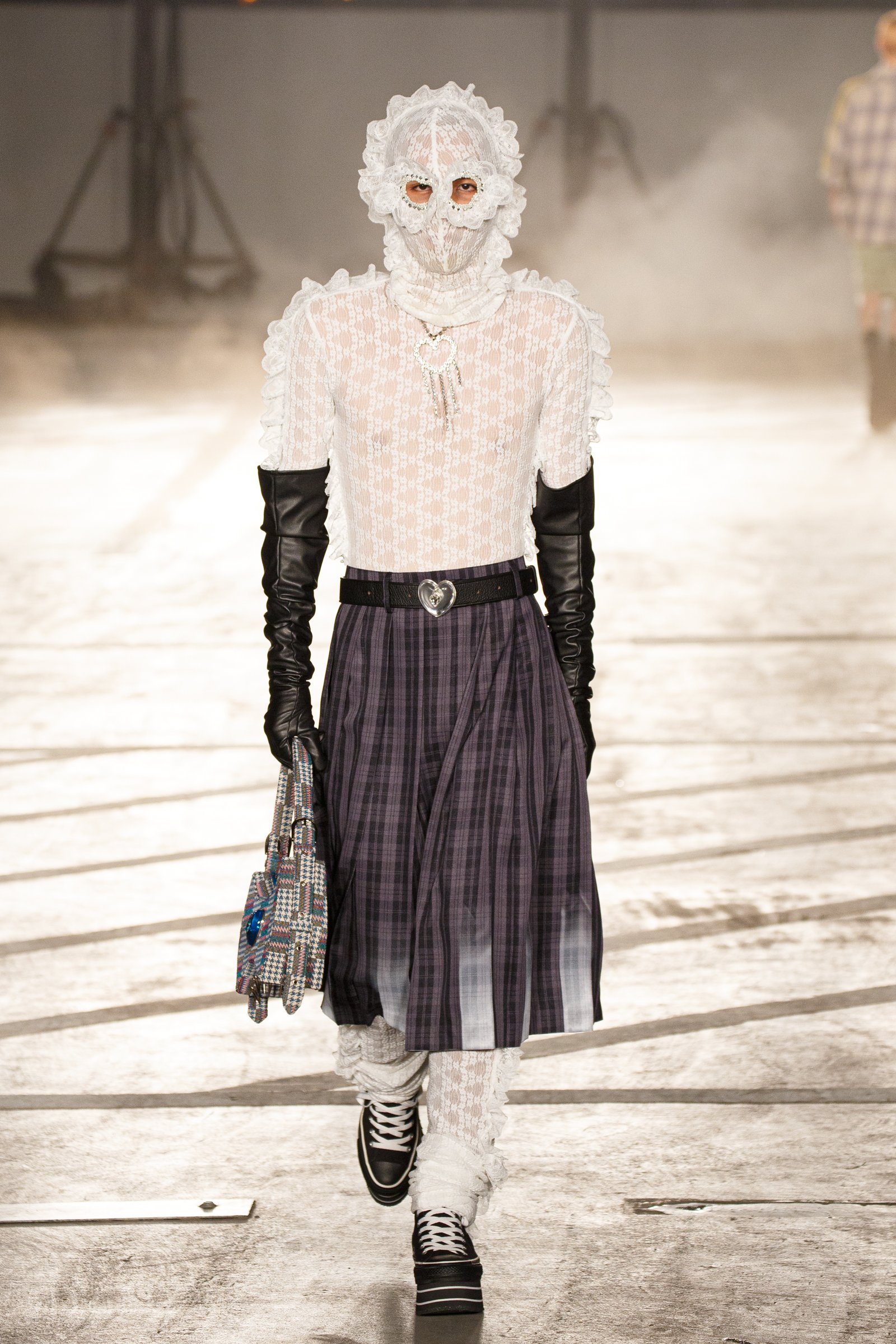 今回のショーは、フリルやレースを使用したガーリーなルックからデニム生地のセットアップ、MA-1など構成したボーイッシュライクなルック、黒のシアー素材やチュールを用いたワンピースでシックな雰囲気をまとったルックなどを披露。その中には「コンバース(CONVERSE)」とコラボレーションした約8㎝の厚底スニーカーと、アイウェアブランド「イナリ(INARI)」とコラボした子犬のような耳のデザインがポイントのサングラスが登場した。