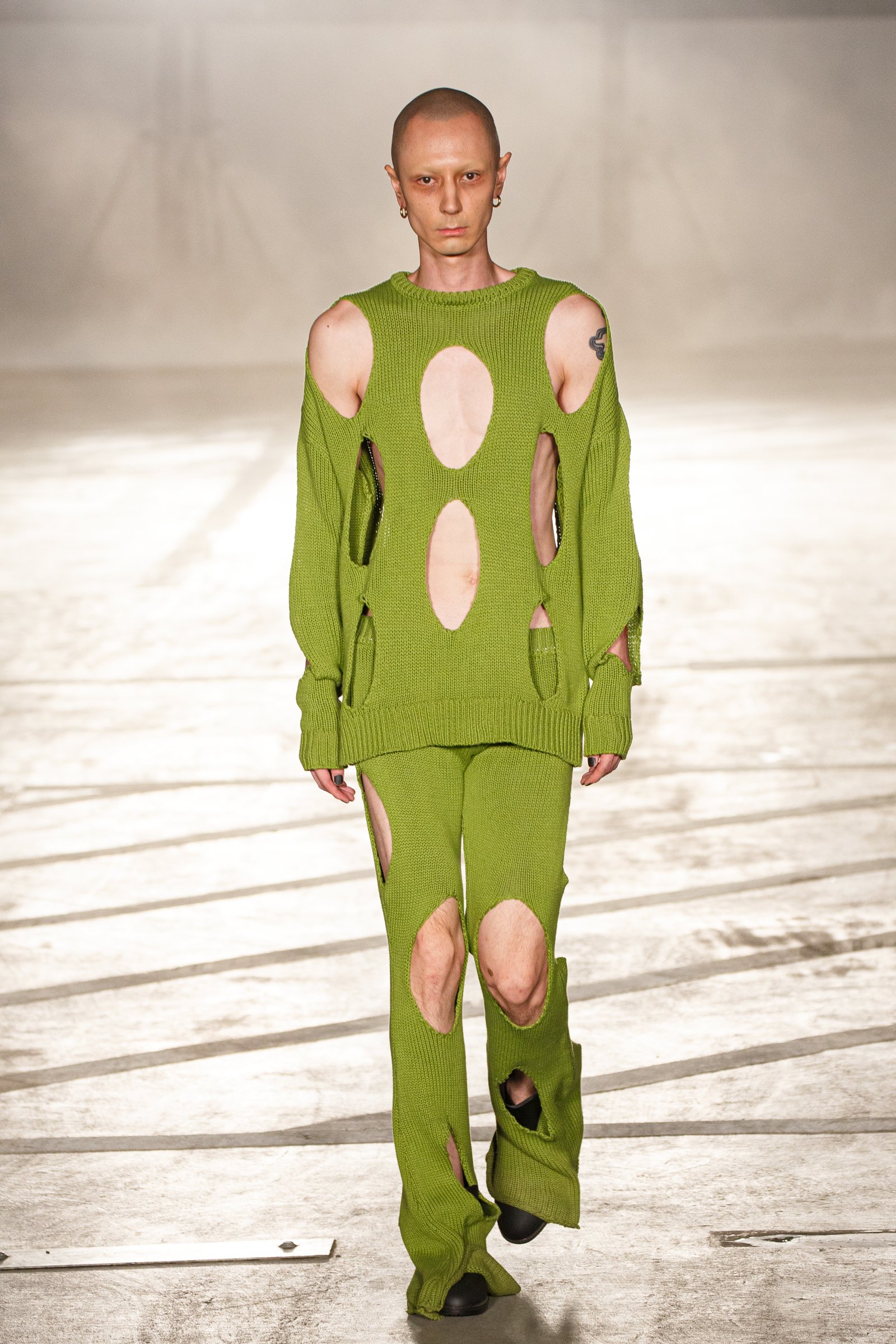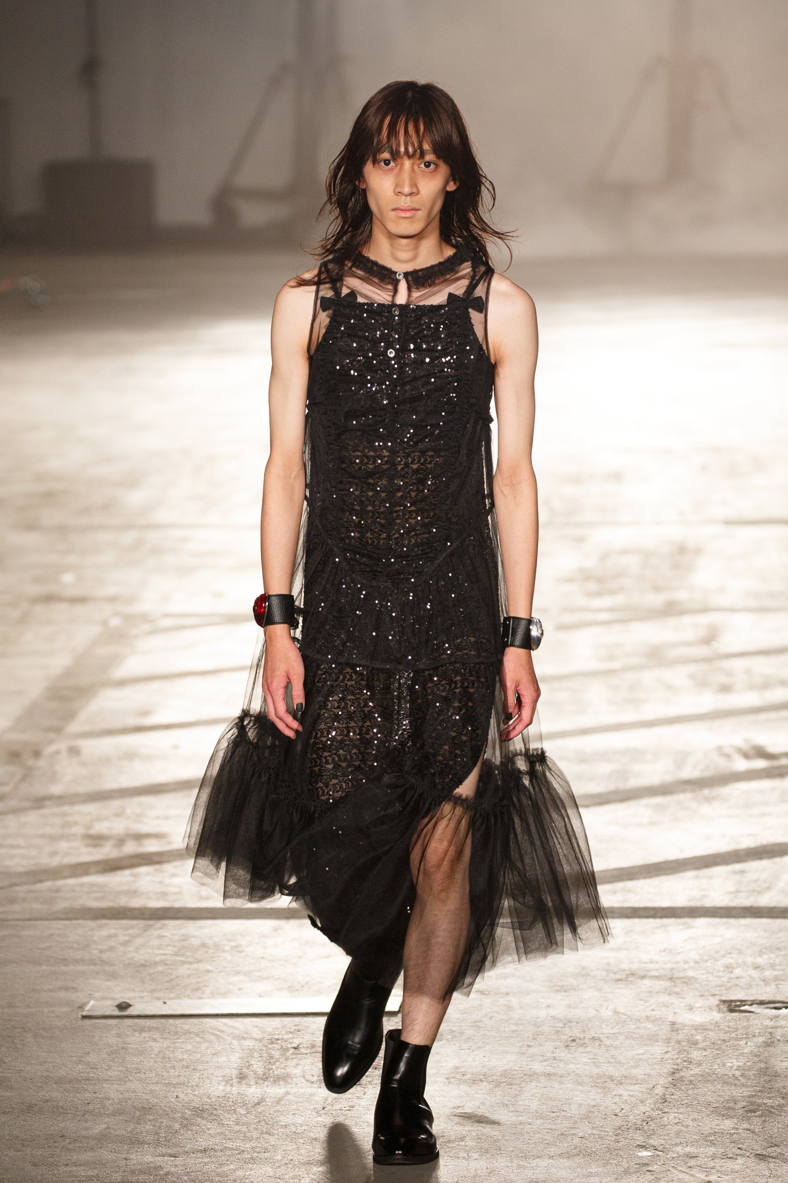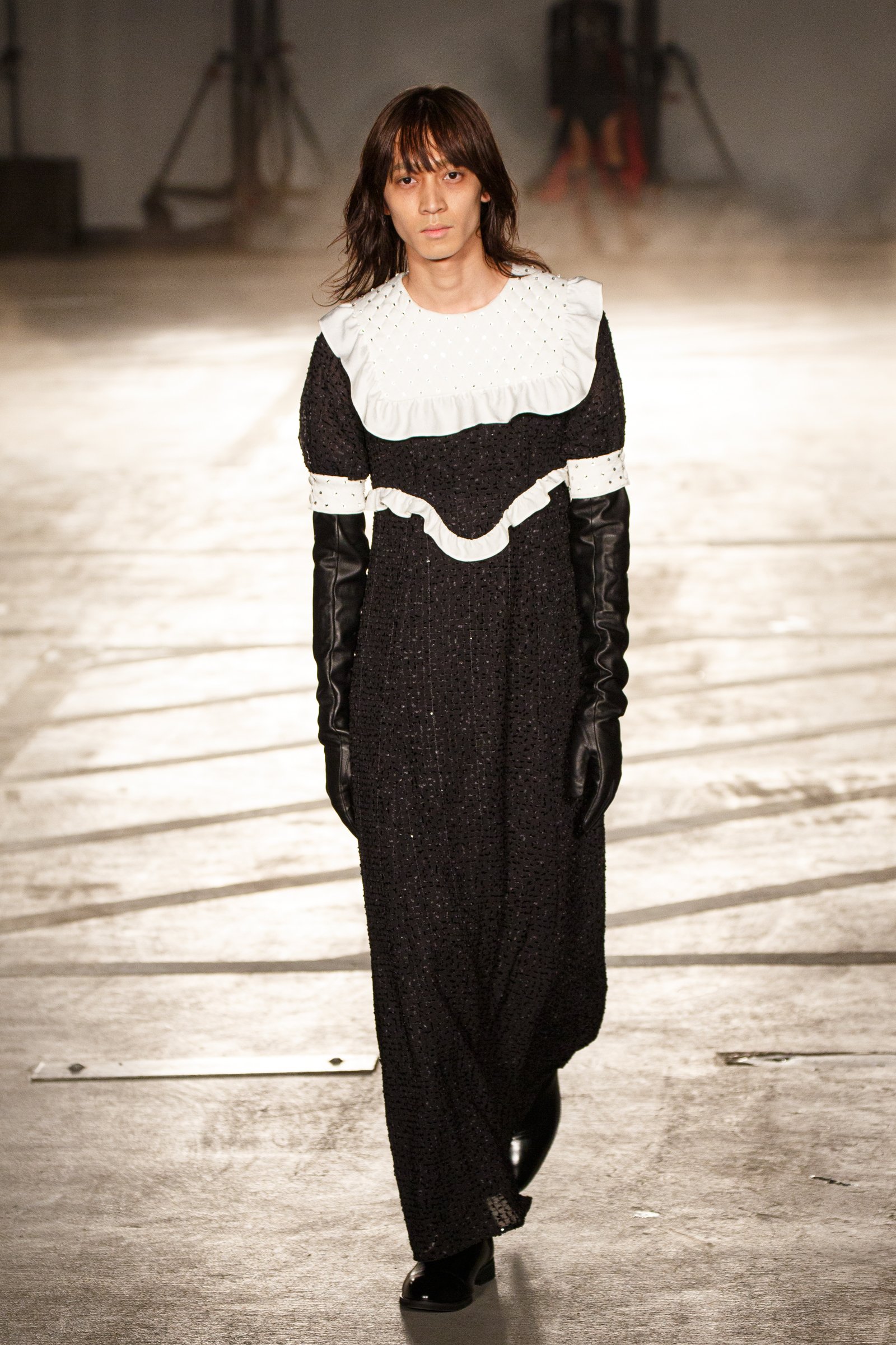 今回のショーでトリを飾ったのは、PELIが初期の段階からDJとして参加している「ファンシーヒム(fancyHIM)」のイベントに出演した経験を持つ、「ル?ホ?ールのト?ラァク? レース」で知られるチャリティ?ケース(Charity Kase)。普段はホラーを軸としたメイクが印象的だが、今回はデザイナーたっての希望でクイーン風のメイクを施し、羽のような装飾が付いたトップスと、ガーターベルトのようになったボトムスが特徴のオールインワンに身を包んだ。ニーナ?ハーゲン(Nina Hagen)の歌う「My Way」をリップシンクしながらランウェイを歩き、会場の観客たちを魅了した。