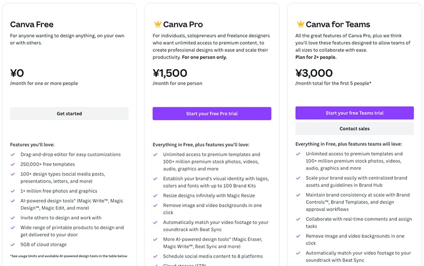Canvaの従量課金プラン一覧(2023年7月時点)