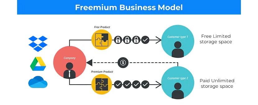 Google DriveやDropboxは、それぞれ15GBと2GBの無料スペースを提供するが、追加スペースを購入する場合は追加料金を請求する。フリーミアムビジネスの典型と言える。