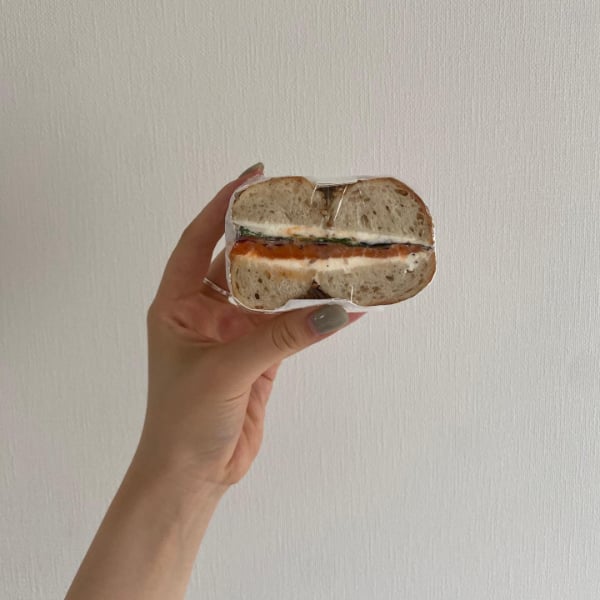 スモークサーモンの塩味とクリームチーズの酸味が絶妙にマッチしていてたまりません。味が濃そうなイメージでしたが、意外と優しい味わいで、ベーグルの味もちゃんと感じることができますよ。